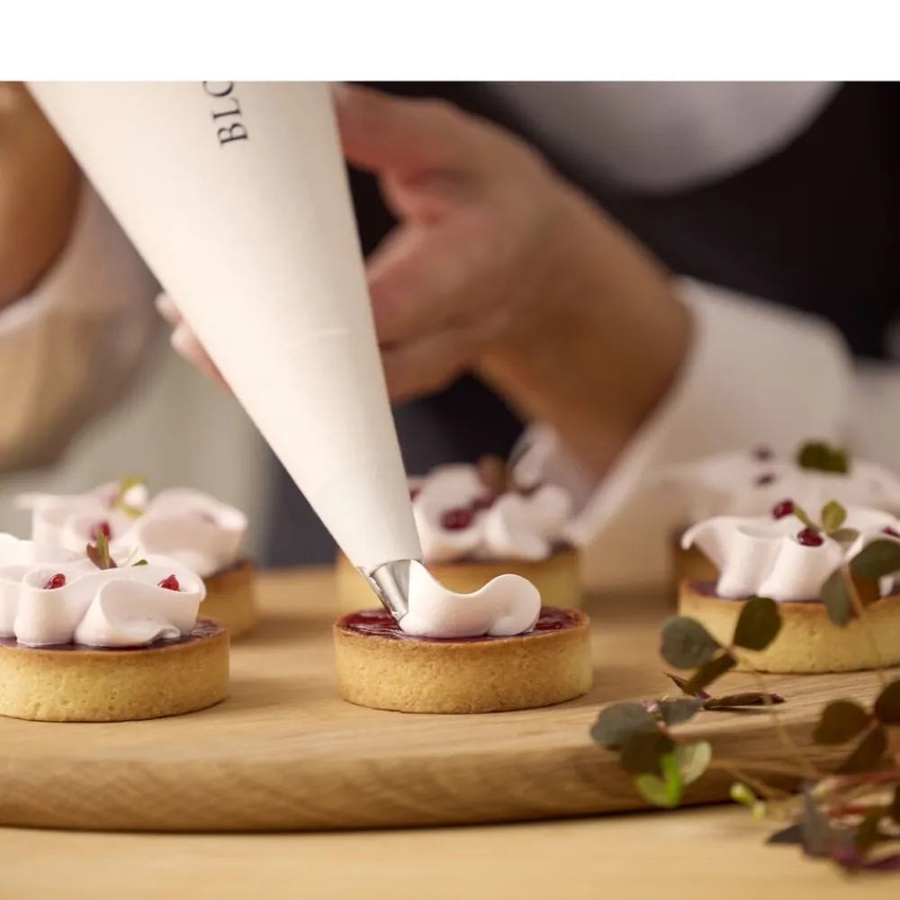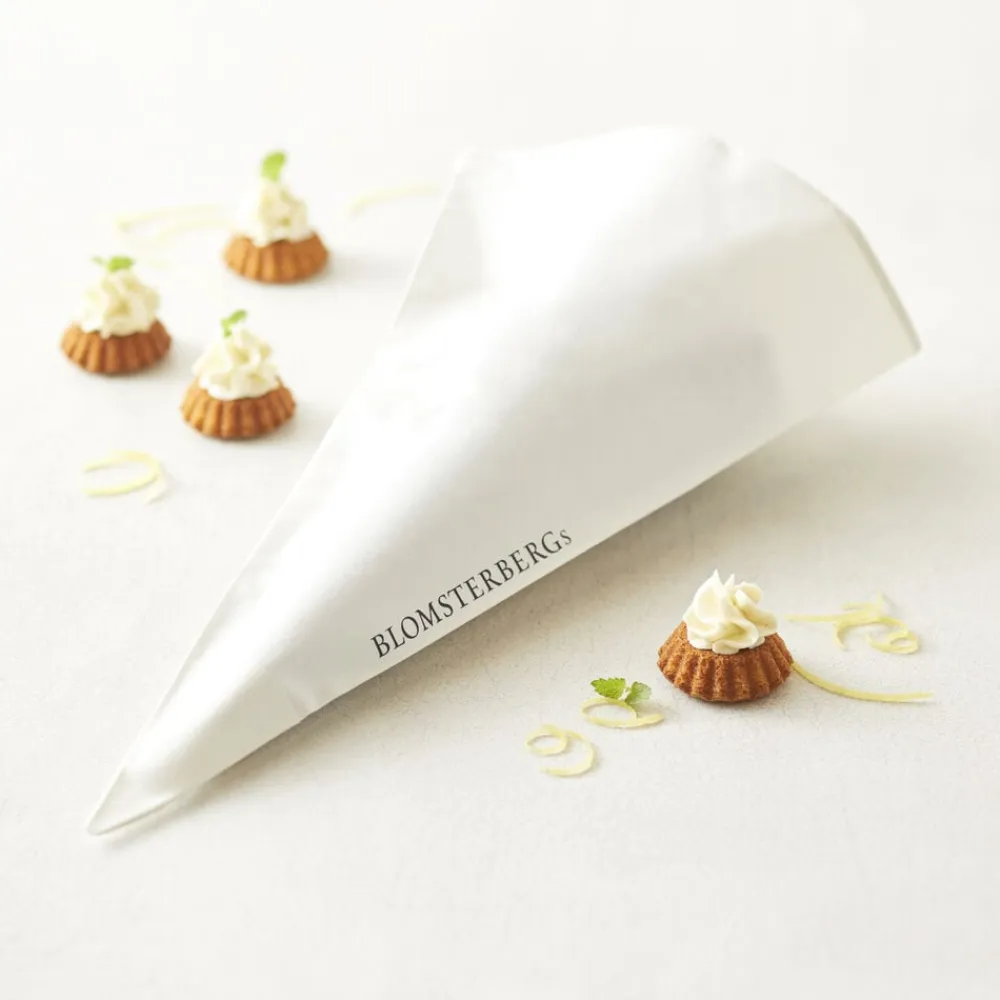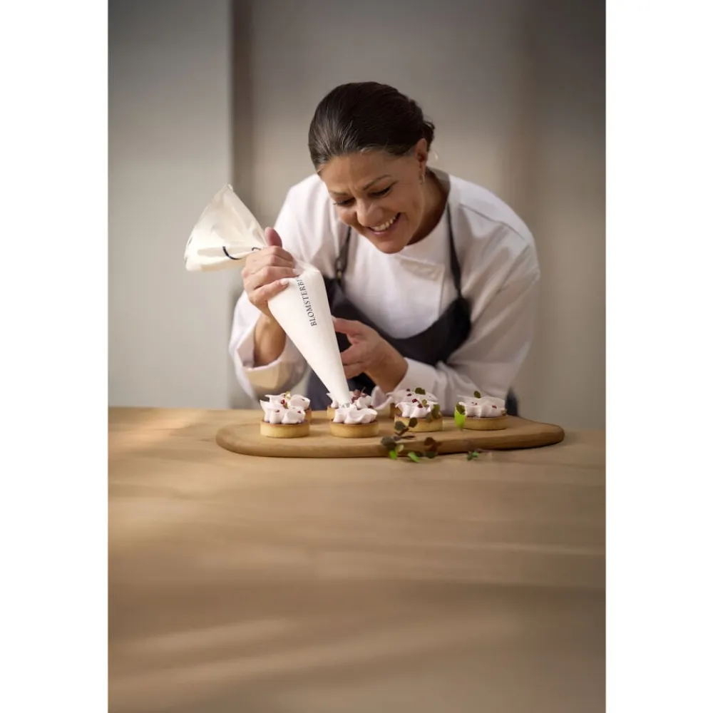 Sprøjtepose i 100 % bomuld, 46 cm, med en kapacitet på ca. 3,4 liter. Inden brug skal det lille hul i sprøjteposen tilpasses tyllerne. Klip med en saks 2-3 mm af posen ad gangen indtil tyllens smalle ende stikker 1 cm ud.