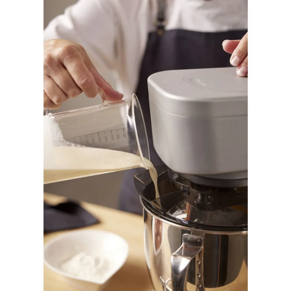 Røremaskinen står stabilt og sikkert på køkkenbordet og er særdeles støjsvag med et lydniveau, der spænder fra blot 39 dB ved laveste hastighed til kun 68 dB ved maks. hastighed, så du kan piske, ælte og røre uden at larme for meget i hjemmet. Det praktiske stænklåg forhindrer spild på bordet, og igennem lågets åbning kan ingredienser nemt tilføjes undervejs. Leveres med piskeris, dejkrog og K-spade. Tilbehørsdele tåler opvaskemaskine.