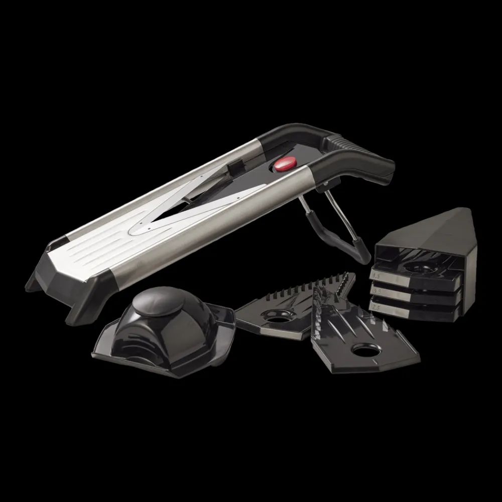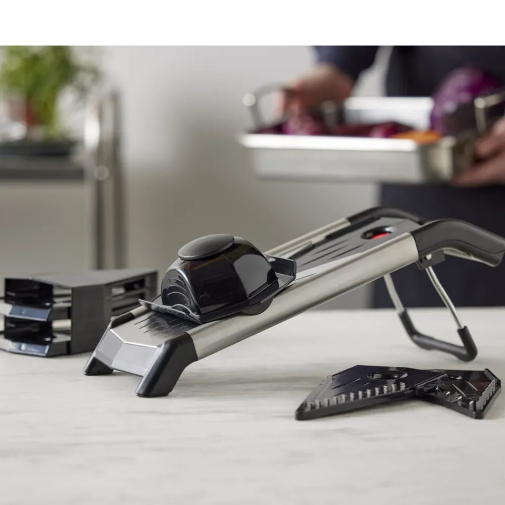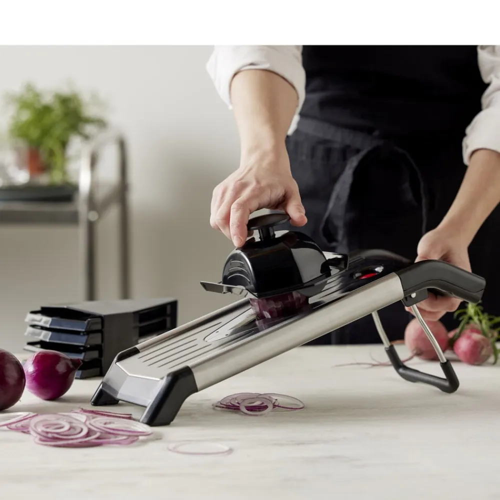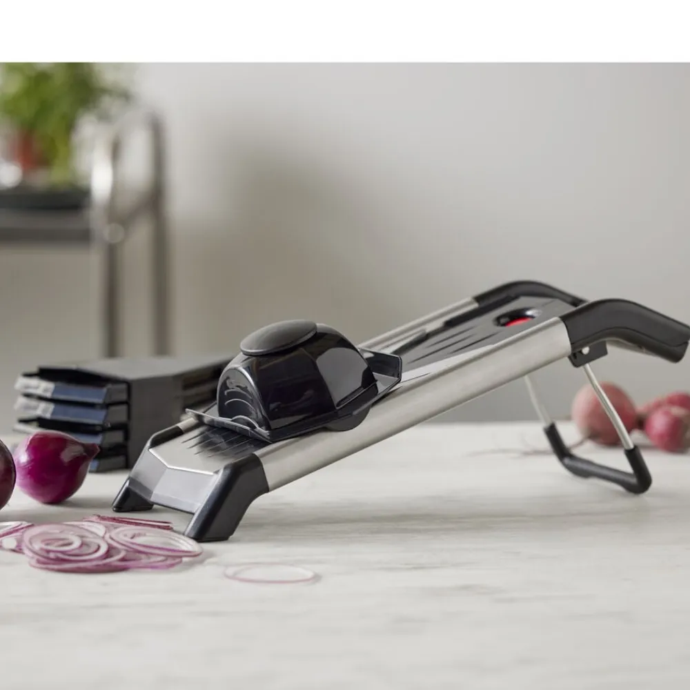 Nemt at indstille til tykke eller tynde skiver på 1,5 mm, 2,5 mm og 3,5 mm. Der medfølger også Julienne-indsatser som skærer strimler på 3,5 mm og 7 mm.