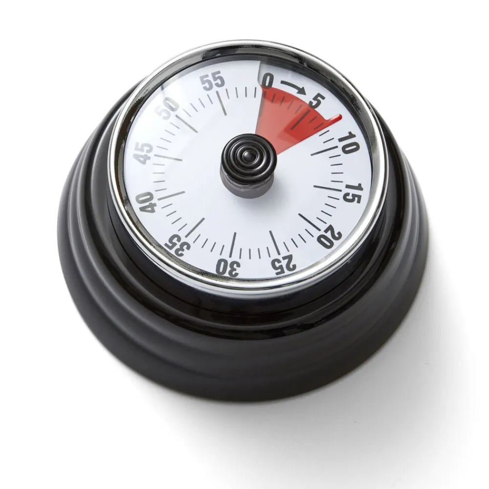 Mekanisk minutur i metal. Alarmen sættes helt enkelt ved at dreje skiven til 60 minutter og derefter tilbage til det ønskede minuttal. Uret har magnet på bagsiden, så det let kan sidde på køleskabet, ovnen, emhætten eller andre metaloverflader.