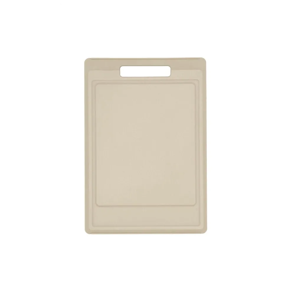 Funktionelt skærebræt i beige plast. Brættet har en bred saftrille på den ene side og er glat på den anden side, og begge sider af brættet kan derfor anvendes til forskellige skæreopgaver.