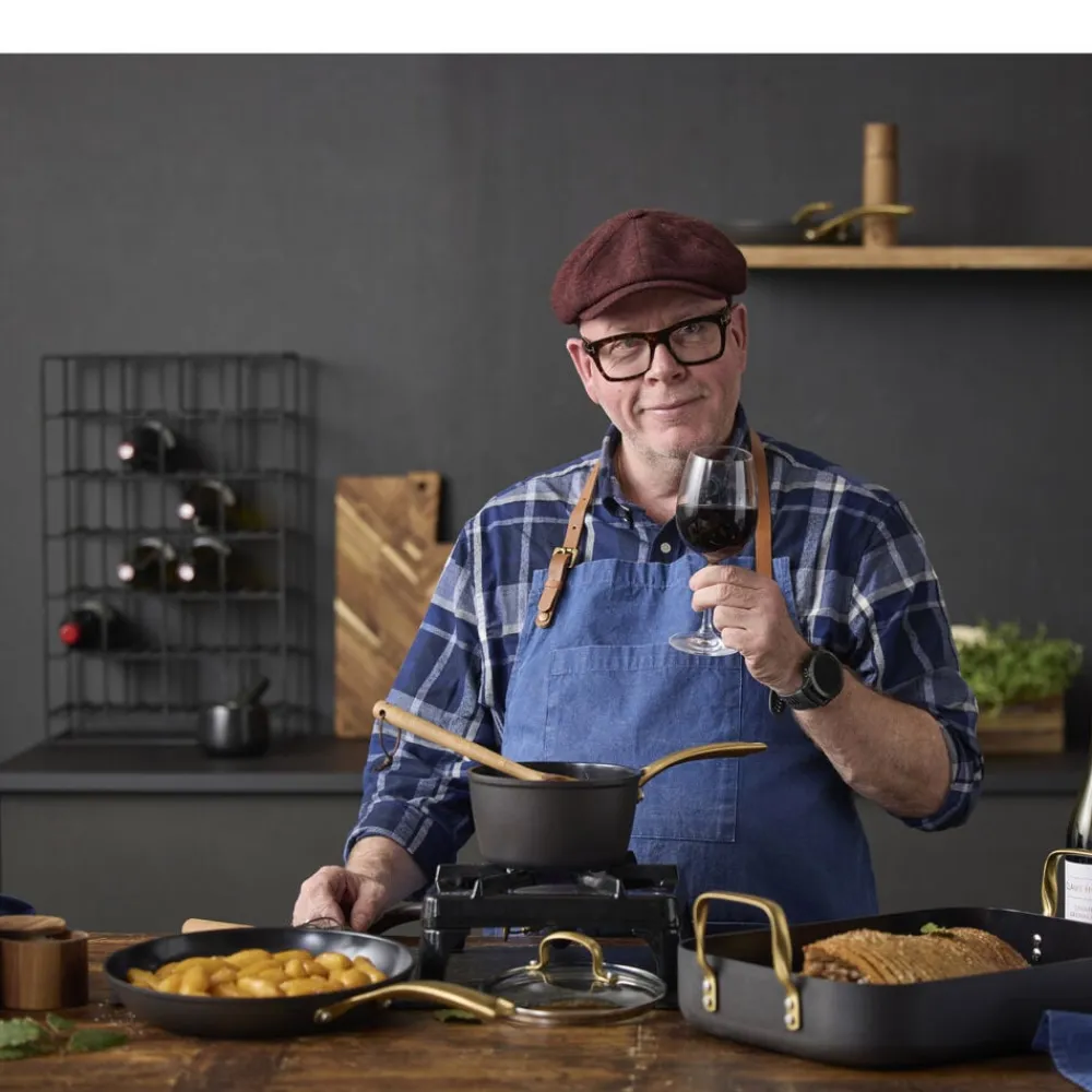 Brasserie-serien er fremstillet i aluminium. Gryder og pander har keramisk belægning indvendigt, sort coating udenpå og mat messingfarvede greb og håndtag. Brasserie er velegnet til alle varmekilder, også induktion, og tåler ovn op til 220 grader. Vi anbefaler at bruge redskaber i plast eller træ. Ikke egnet til opvaskemaskine. Vaskes med varmt vand og sæbe før første brug. Den keramiske belægning er fremstillet af råvarer, der ikke indeholder PFAS.