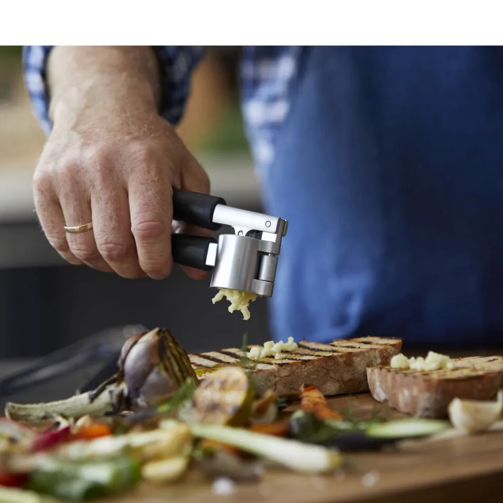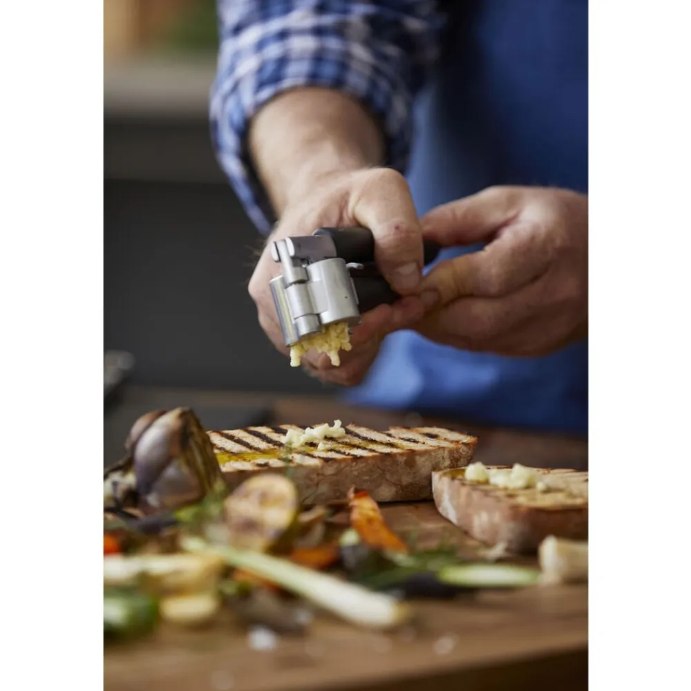 Efter brug kan stempel og bund nemt skylles og renses for hvidløgsskaller, fordi beholderens ene side let klikkes åben og svinges til side på hængslet.