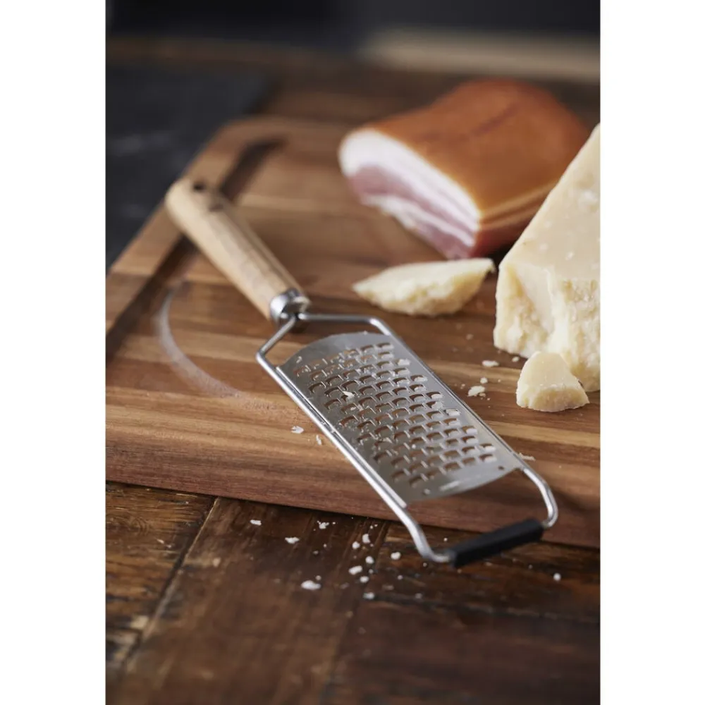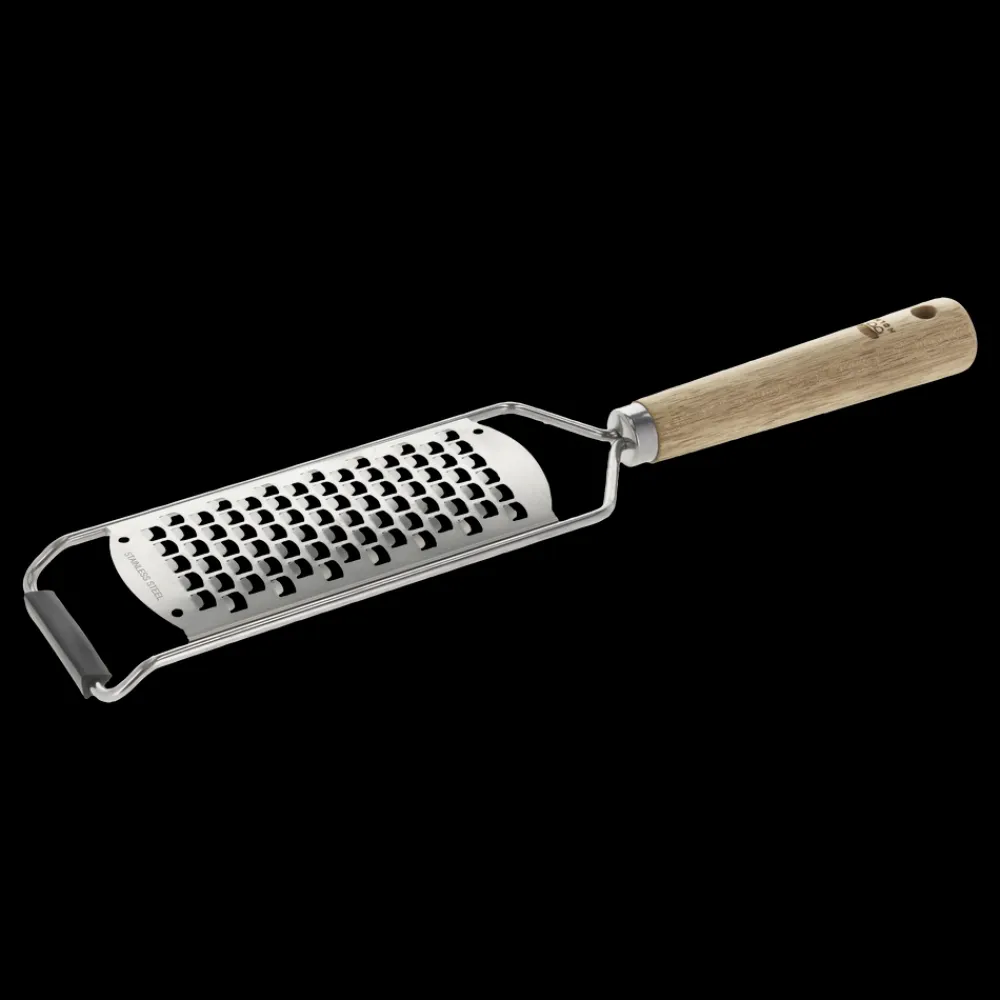Groft rivejern med stor riveflade i rustfrit stål og skaft af akacietræ. Velegnet til ost, chokolade, løg og lignende. Rivejernet har en trekantet silikoneforstærkning i bunden, så det står bedre fast, når du støtter det mod underlaget ved brug, samt beskyttende skærebladsværn for sikker opbevaring.