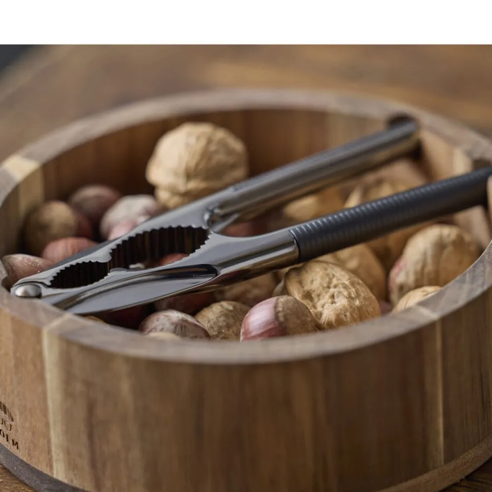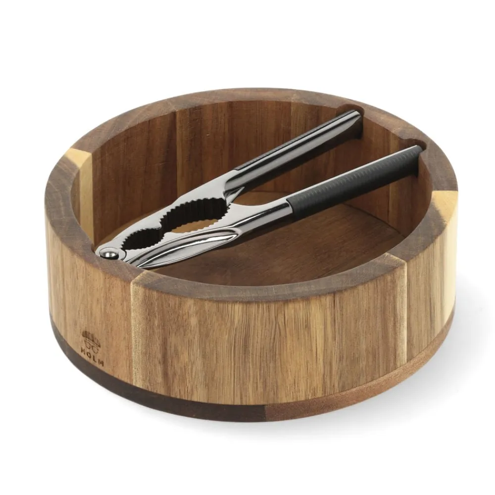 Nøddeknækkersæt med rund skål af akacietræ, dia. 17 cm, og nøddeknækker i metal med sort greb. Nøddeknækkerens hoved og håndtag passer ned i de små fordybninger på skålens kant, så den altid kan ligge klar til at knække nødder. Læg aldrig akacietræ i blød. Vaskes med varmt vand og mild sæbe. Tåler ikke opvaskemaskine. Kan med fordel efterbehandles med madolie et par gange om året.