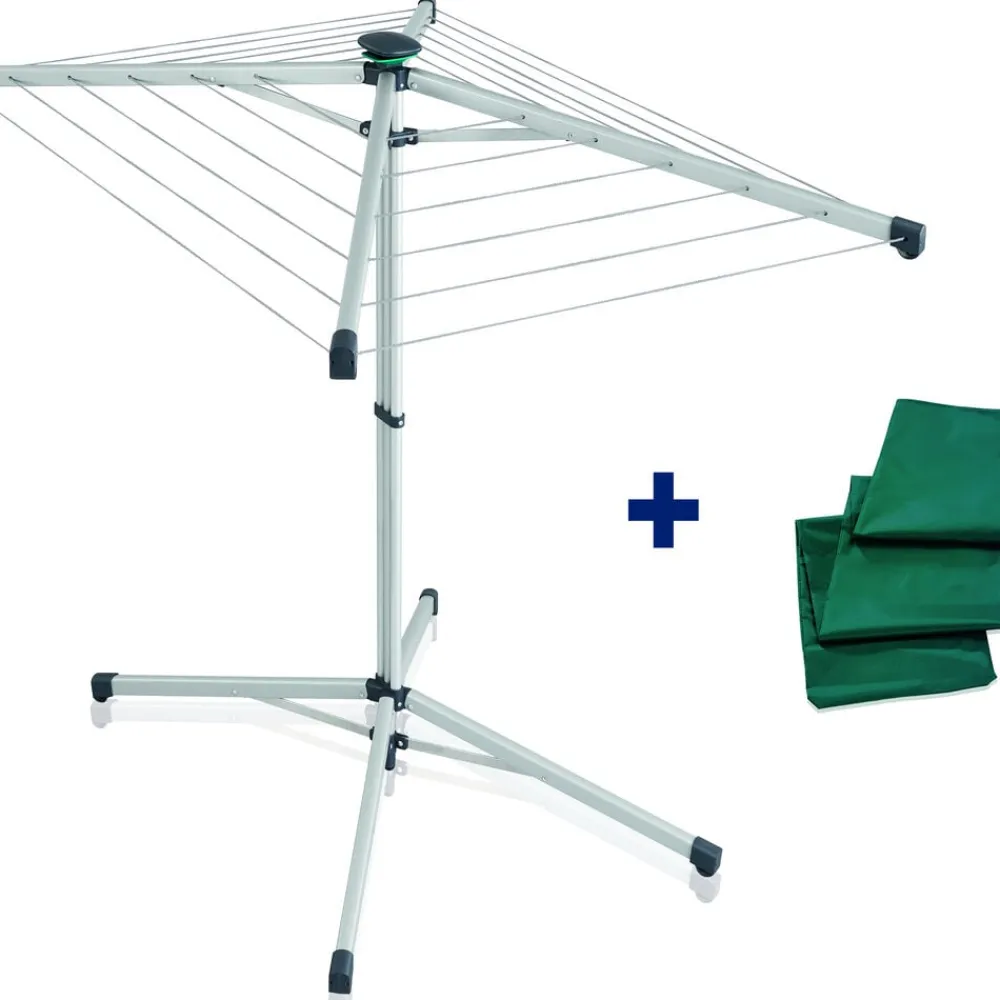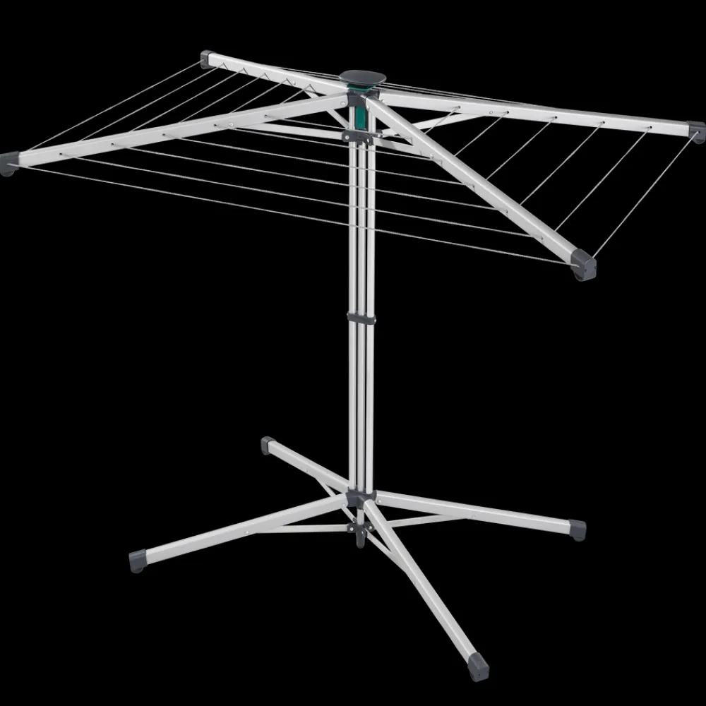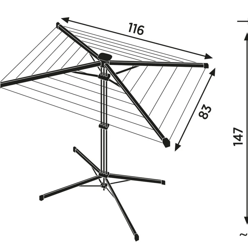 Stativet vejer kun ca. 3,5 kg og er let at transportere. Overtræk medfølger, så stativet nemt kan beskyttes mod snavs – rene snore, rent vasketøj. Stativet har 14 meter tørreplads, svarende til en maskinvask. Den yderste række snore har en bredde på 110 cm og dermed god plads til brede stykker vasketøj. Sammenslået højde 147 cm, opslået makshøjde 110 cm. Tørrearealet måler 83 x 116 cm, når stativet er slået ud.