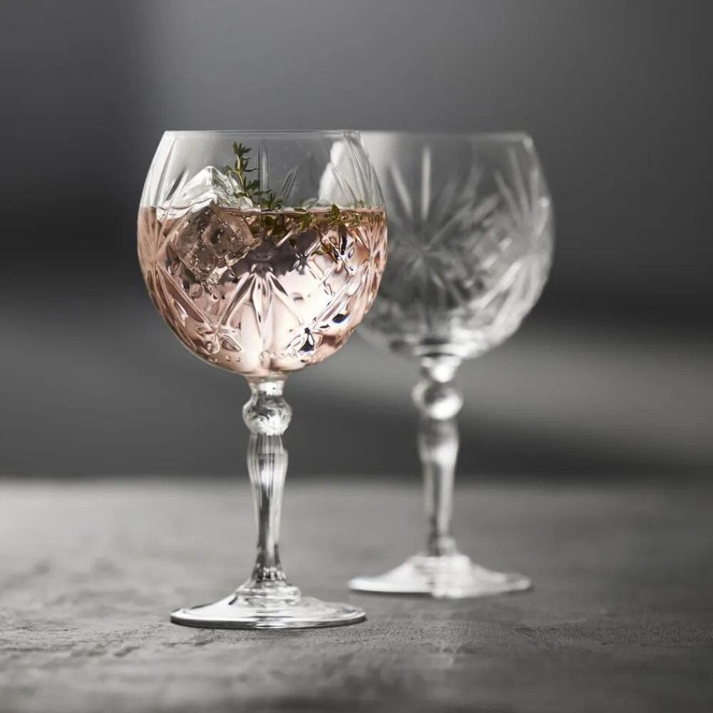 Nyd en forfriskende G&T af det klassiske glas, som fremhæver drikkens nuancer, når omgivelsernes lys og skygger reflekteres i glassets smukke mønster. Tåler opvaskemaskine. 65 cl, 4 stk.