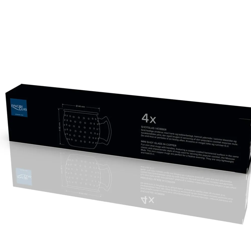 4 stk. shotglas i stål med hank og kobberbelagt, hamret yderside i samme karakteristiske design, blot i miniformat, som det klassiske krus til den populære cocktail moscow mule, der har fået et moderne comeback.