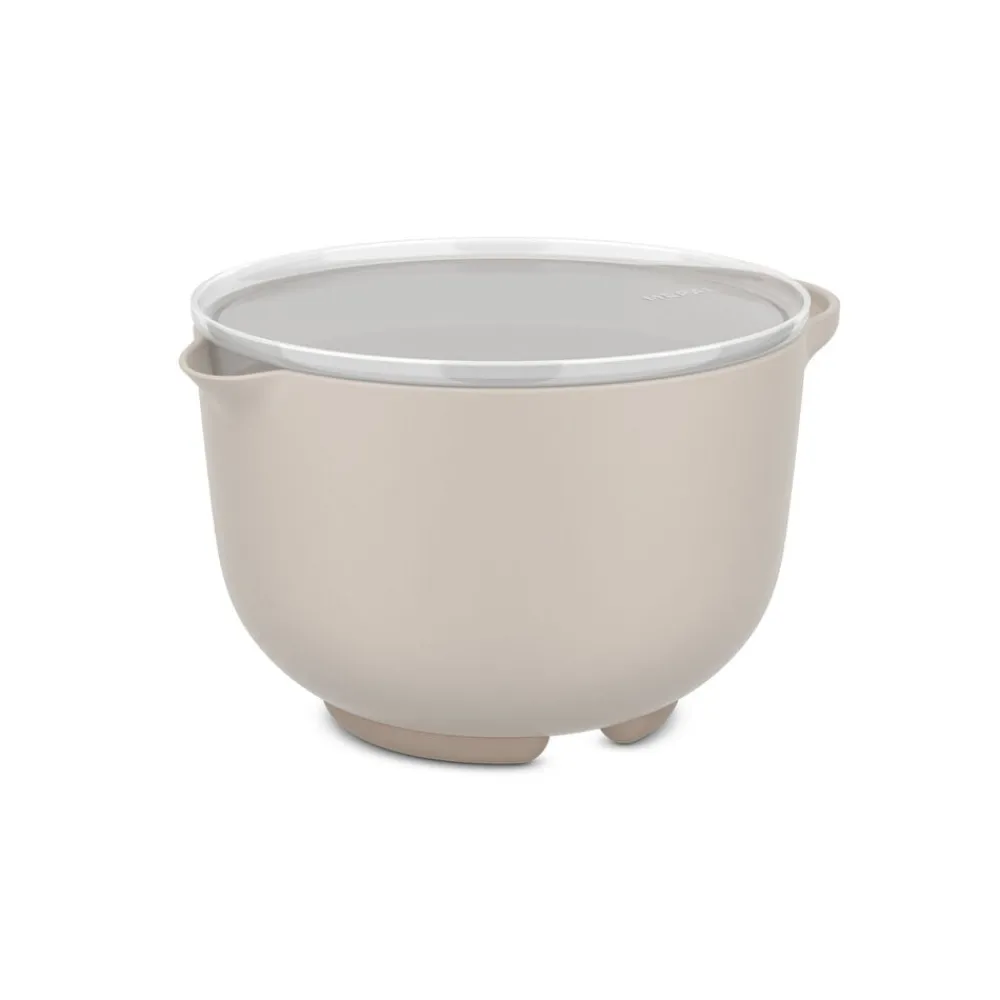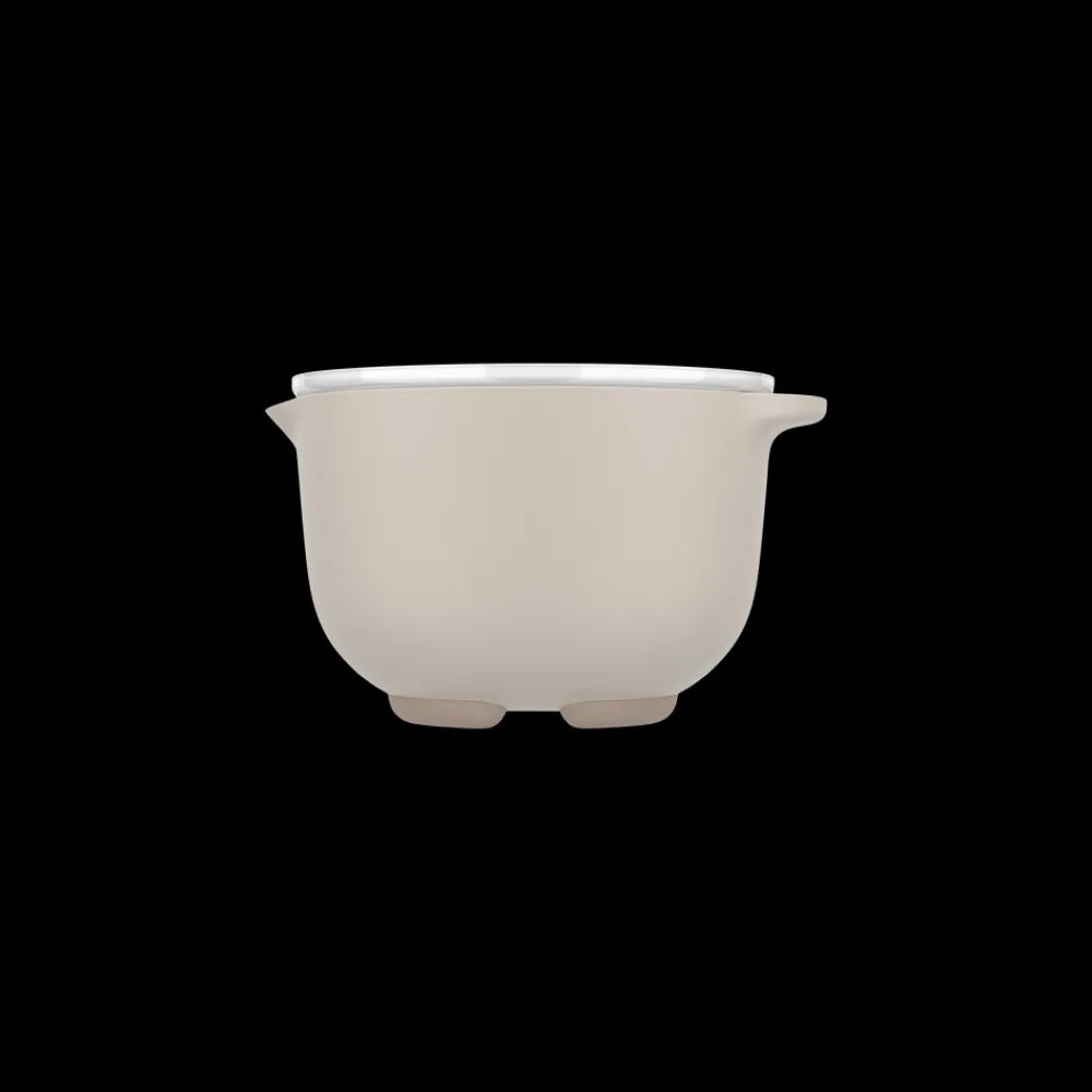 Røreskålen er lavet af pp, et plastmateriale, der tåler mikrobølgeovn og temperaturer op til 110 °C. To smarte åbninger i den skridsikre bundring under røreskålen forhindrer, at der samler sig vand, når du sætter skålen på hovedet i opvaskemaskinen.