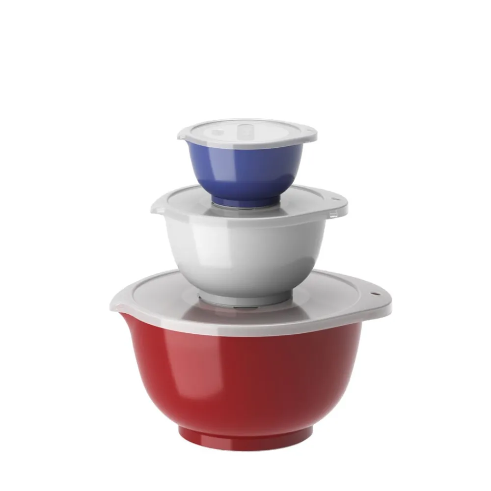 Margrethe røreskålesæt fra Rosti i 3 af de mest anvendte størrelser. Sættet indeholder 0,25 blå + 0,75 hvid + 3 liter rød Margrethe-skåle med tilhørende låg.