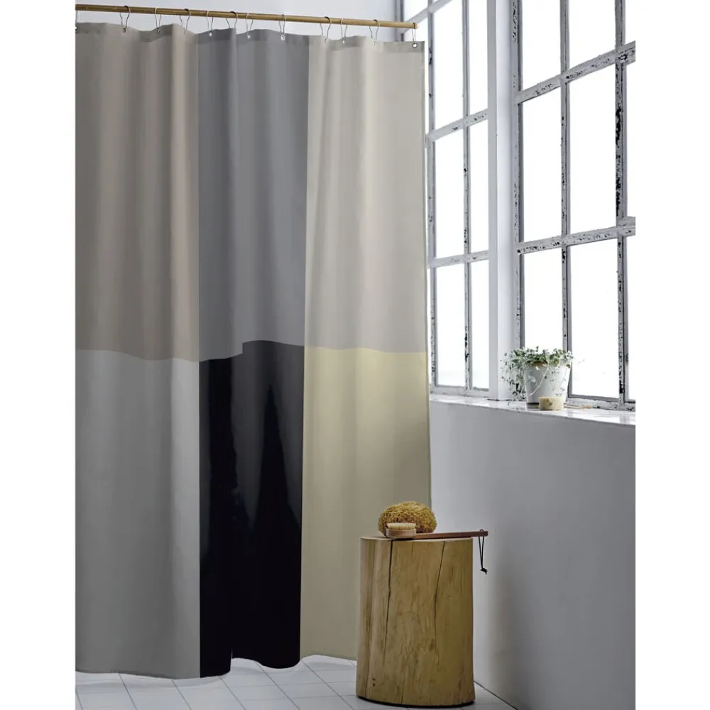 Fusion er et moderne og grafisk badeforhæng i colour block-design. Det er fremstillet i 50 % genanvendt polyester og 50 % konventionel polyester.