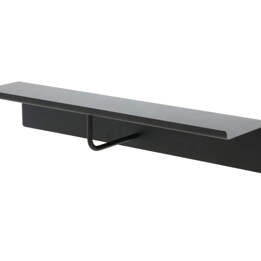 Minimalisme og funktion i smuk forening. Hattehylden fylder behageligt lidt i rummet. Den består af en tophylde med plads til huer, vanter, paraplyer m.v. Under hylden er en bøjlestang vinkelret monteret, så det ikke er skulderen på jakken, men fronten, der vender udad. Det giver et klædeligt udtryk i entréen. Afhængig af tykkelsen på overtøjet er der plads til 4-5 stykker. Takket være de medfølgende skjulte vægbeslag slipper du for synlige skruer. Udført i pulverlakeret stål.