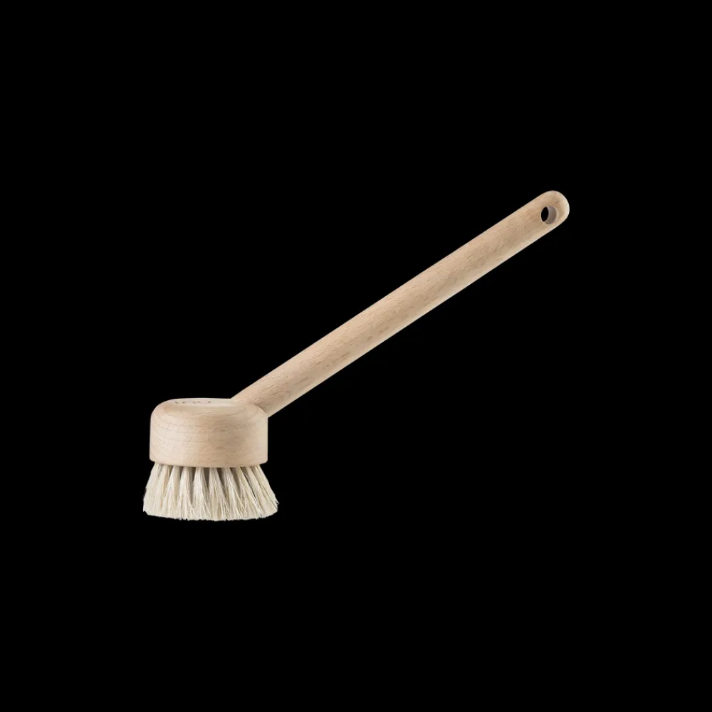 Inu opvaskebørsten er udført i bøg og behandlet med bivoks. Sammen med det runde skaft sikrer bivoksen et blødt og behageligt greb. Vinklen mellem hoved og skaft er helt perfekt. Det kan du mærke allerede ved første kop. Et rundt hul i enden af skaftet gør det muligt at sætte en strop i, hvis du foretrækker, at børsten hænger. Den smukke organiske form og materialevalget går igen i både grøntsagsbørste og grydebørste i samme serie.