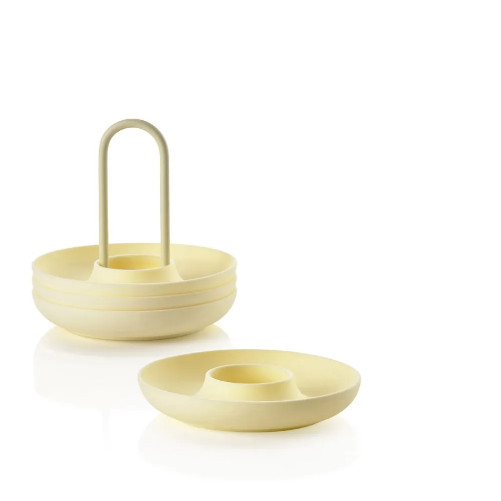 De fire æggebægre i holder fra Singles kan sættes på bordet med kun én hånd. Og den buede kant fanger både salt, æggeskaller og gæsternes opmærksomhed. Så kan du spise brunch med stil – fx i selskab med gode venner.