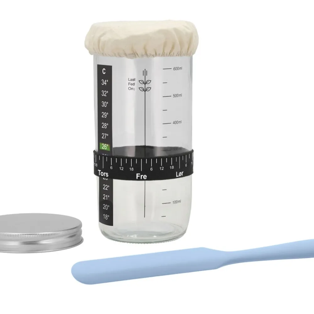 Kom nemt i gang med surdejsbagningen med dette surdejsstartsæt, der indeholder en 700 ml glaskrukke, aluminiumslåg, åndbart stofbetræk med elastik, en smal silikoneskraber, temperaturstrimmel og et elastikbånd med tidsmarkeringer.