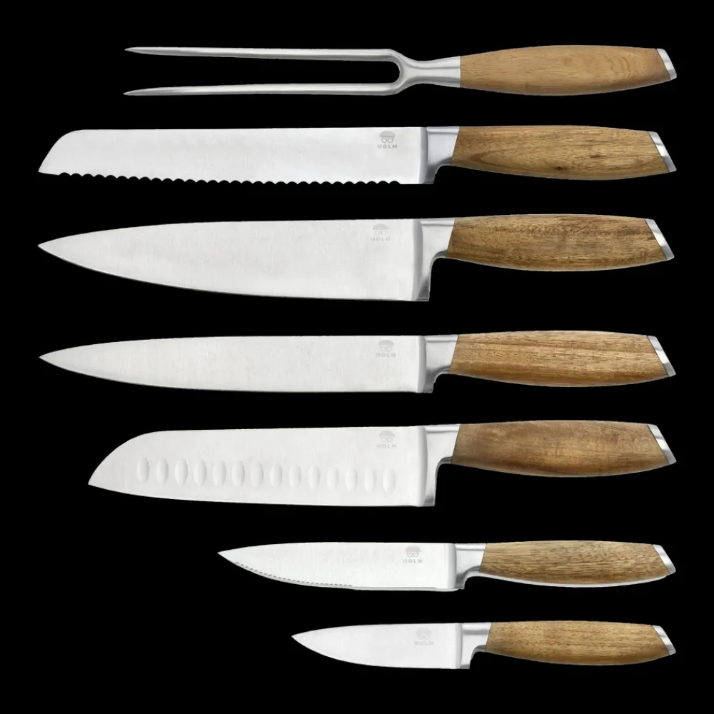Knivsættet indeholder seks lækre knive – urtekniv 20 cm, universalkniv 24 cm, santokukniv 31 cm, filetkniv 33 cm, kokkekniv 33 cm, brødkniv 33 cm – og en stegegaffel 29 cm. De flot rundede skafter, der ligger behageligt i hånden, er af akacietræ med virkeligt smukke og karakteristiske åretegninger og er afsluttet med en elegant stålkappe for enden af skaftet. Bladene er af rustfrit stål i høj kvalitet. Knivene skal vaskes i hånden med varmt vand og sæbe, også før første brug.