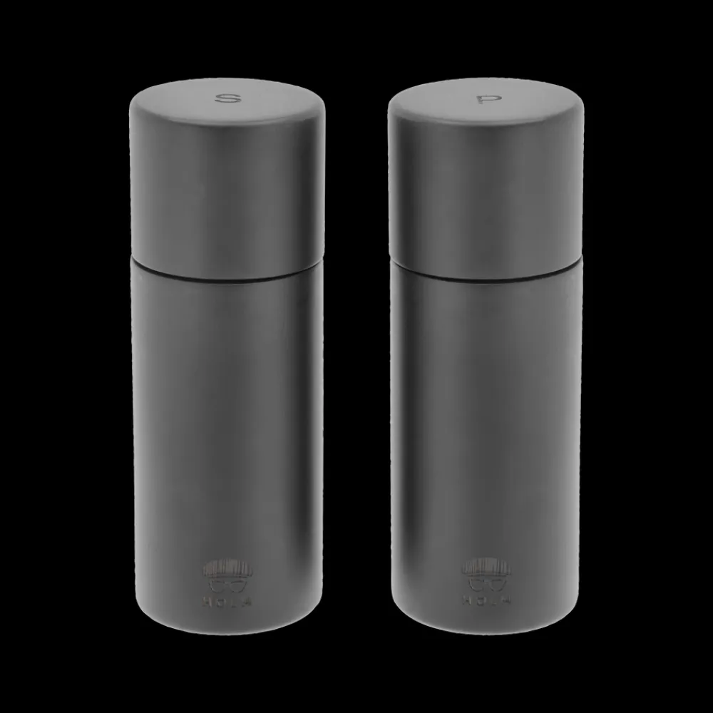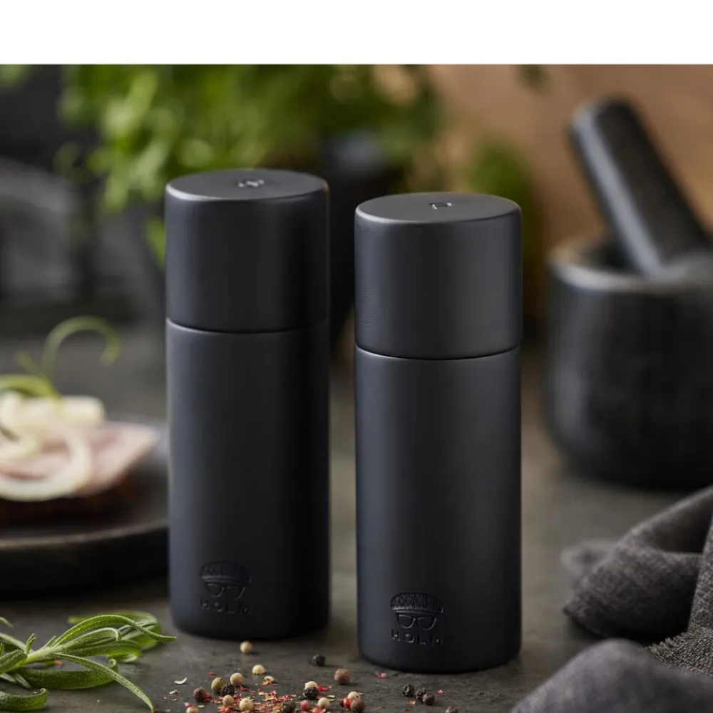 Flot salt- og peberkværnsæt i sortmalet akacietræ med keramisk kværnindsats. Kværnene er cylindriske med et helt enkelt look, og et diskret S eller P præget i toppen markerer kværnens indhold. Du kan selv bestemme, hvor groft eller fint du ønsker at kværne dit salt eller peber. Malingsgraden justeres nemt i bunden af kværnen.