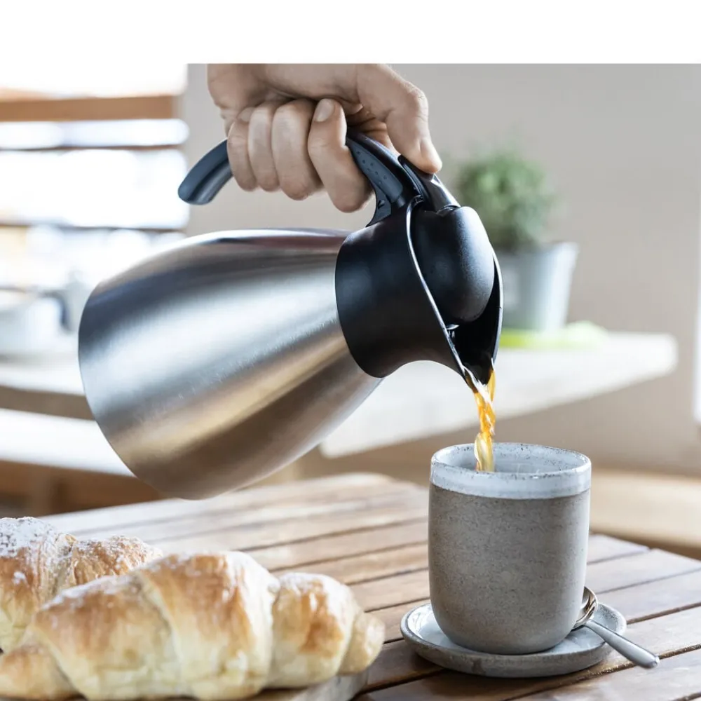 Klassisk termokande i et solidt, praktisk design. Mat, rustfrit stål i høj kvalitet. Dobbeltvægget indsats af rustfrit stål, der er yderst robust og holdbart over for slag og stød. Unikt og praktisk hældesystem. Kan betjenes med én hånd. Holder varmt i 12 timer og koldt i 24 timer.