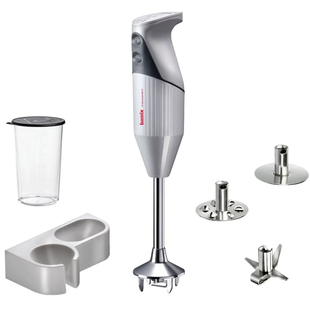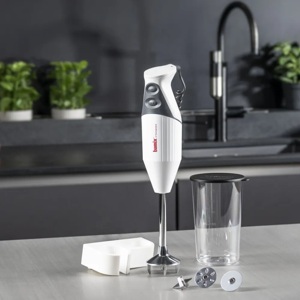 bamix® Mono-stavblender med en kraftig 200 watt motor, der sikrer pålidelig hjælp til selv de hårdeste opgaver i køkkenet. Stavblenderen har to hastighedsindstillinger, softgrip-sikkerhedsknap og en praktisk ledning, der giver masser af fleksibilitet. Til produktet medfølger multifunktionskniv, blenderskive, piskeskive, bæger med låg 600 ml og vægholder samt en instruktionsmanual. Livstidsgaranti på motor.