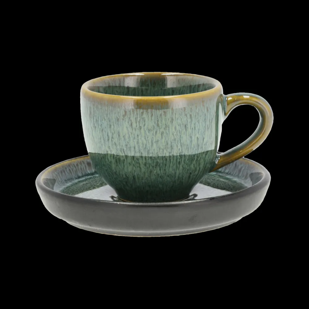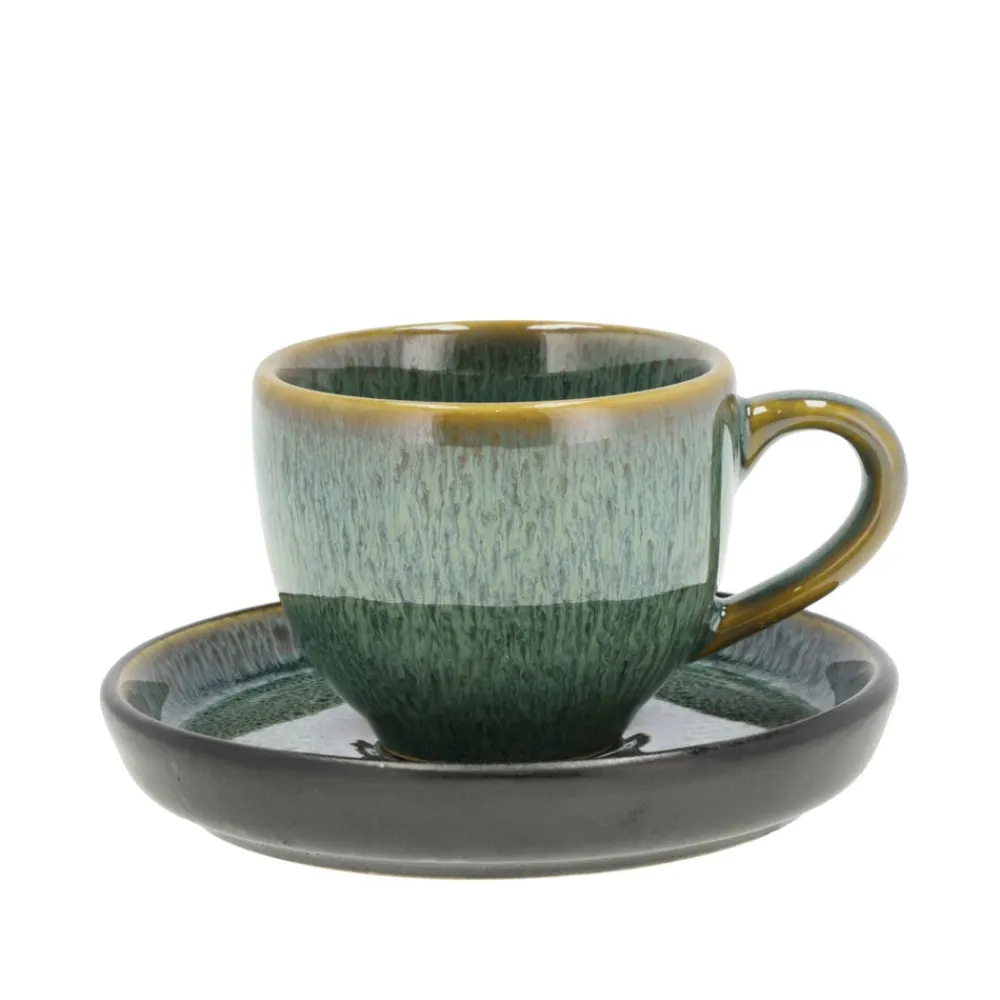 Flot espressokop med hank og matchende underkop i robust stentøj. Underkoppen har mat, sort glasur på ydersiden, mens oversiden har den samme blanke, farvede glasur, som går igen både udvendigt og indvendigt på koppen. Indeholder 7 cl. Dia. 5,5 x 5 cm. Stentøjet tåler maskinopvask, mikroovn og ovn op til 220 grader.