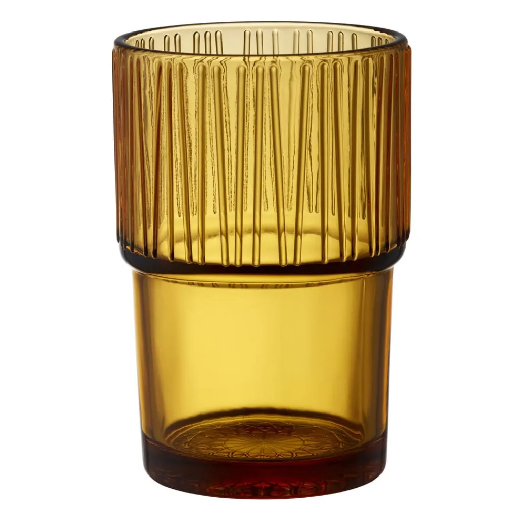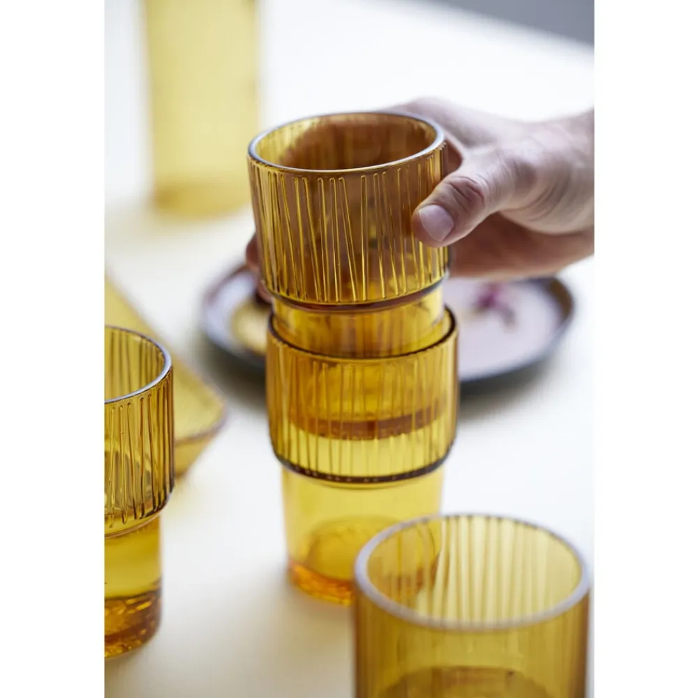 4 stabelbare caféglas, 38 cl, i gennemfarvet glas til både kolde og varme drikke. Nyd caffe latte, te, chai latte, varm kakao og meget andet af de smukke og solide glas, der gør hverdagen lidt skønnere. Velegnet til opvaskemaskine. Når du køber fra Kusintha-kollektionen, støtter du udsatte børn i verdens fattigste områder.