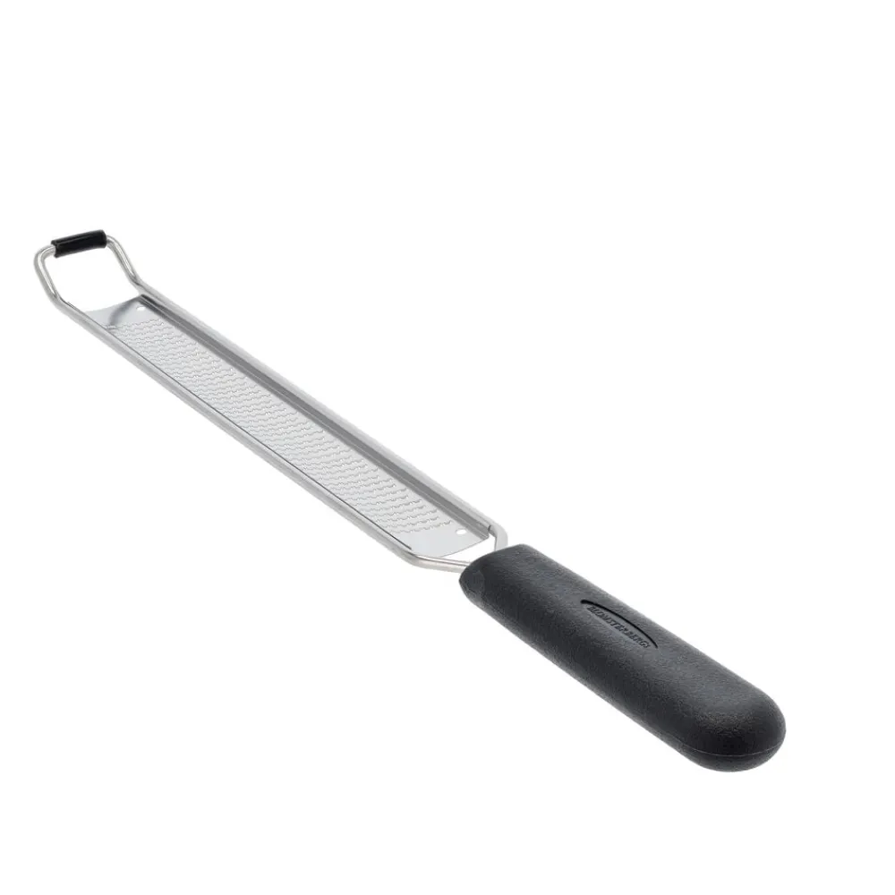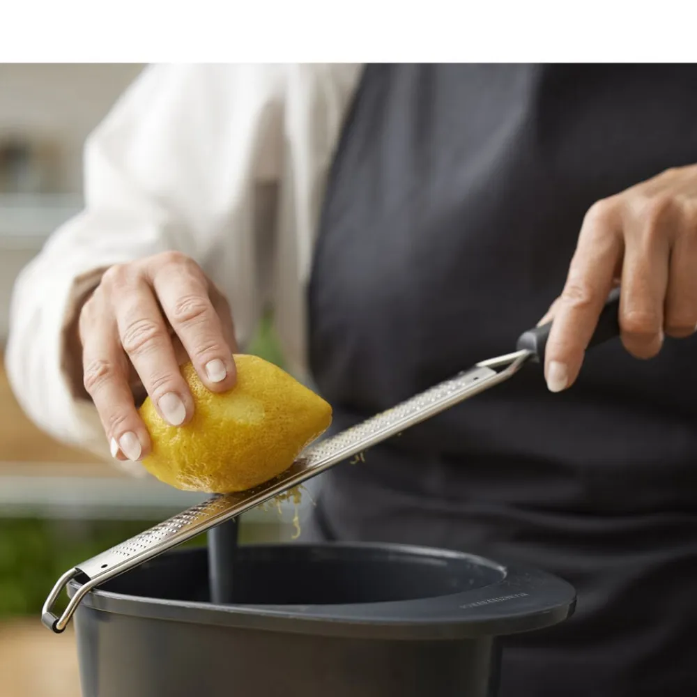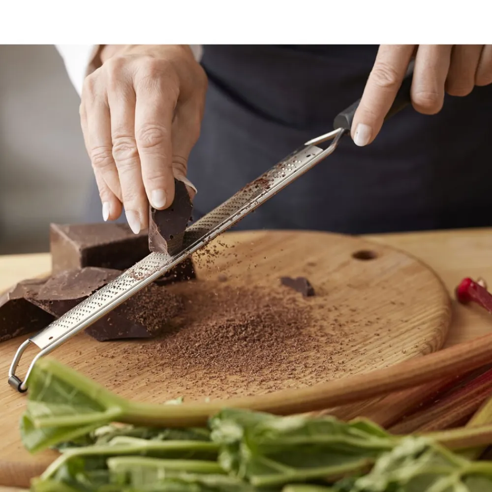 Dette ultrafine citrusrivejern i robust, rustfrit stål er perfekt til at rive det alleryderste lag af alle citrusfrugter, så du kun får den unikke og lækre smag af skallen uden bitterhed. Brug det også til at rive fint fnuller af chokolade eller frisk ingefær, parmesan, muskatnød, hvidløg m.m.