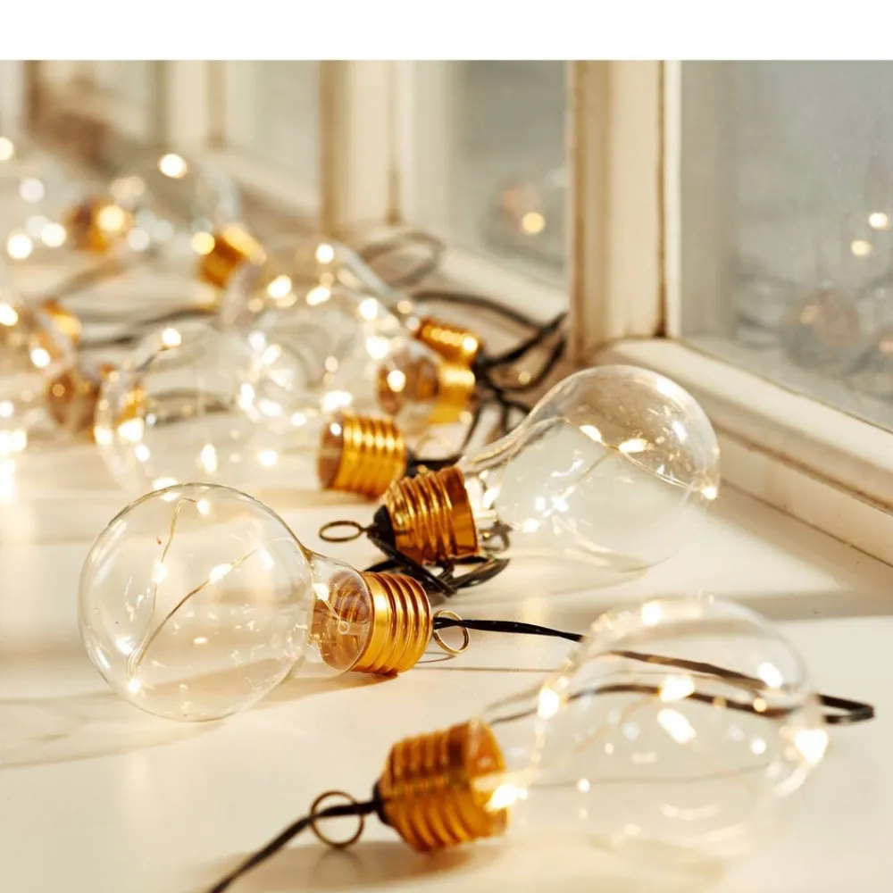 Lad lyset skinne klart, så alle kan se, at der er noget at fejre. Den 3,2 m lange LED lyskæde har 10 transparente pærer i glas, der hver måler 6 x 10,5 cm. Mellem hver pære er der en afstand på 30 cm, og afstanden mellem batteriboksen og den første pære er 50 cm. Tænd for lyset med 3 x AA batterier (ikke inkluderet), og hæng kæden op indendørs for særlig festlig belysning.