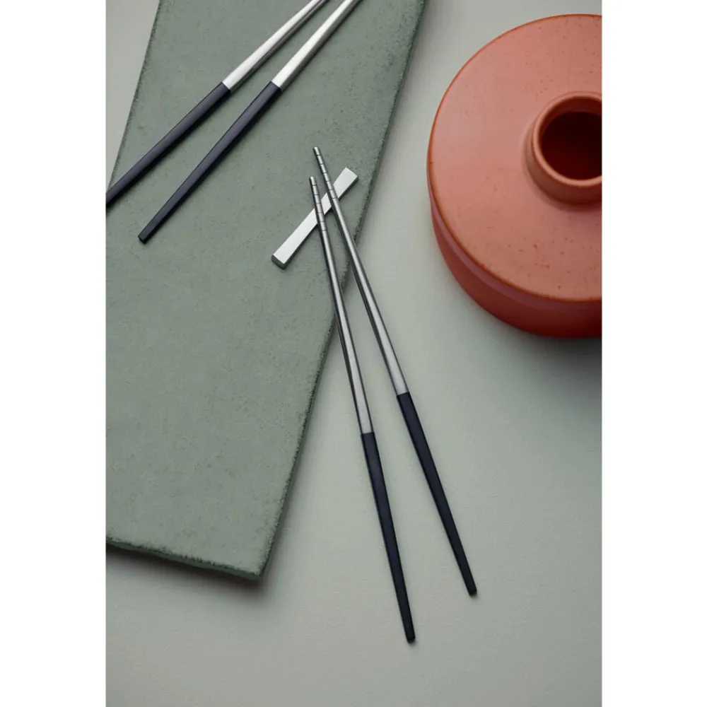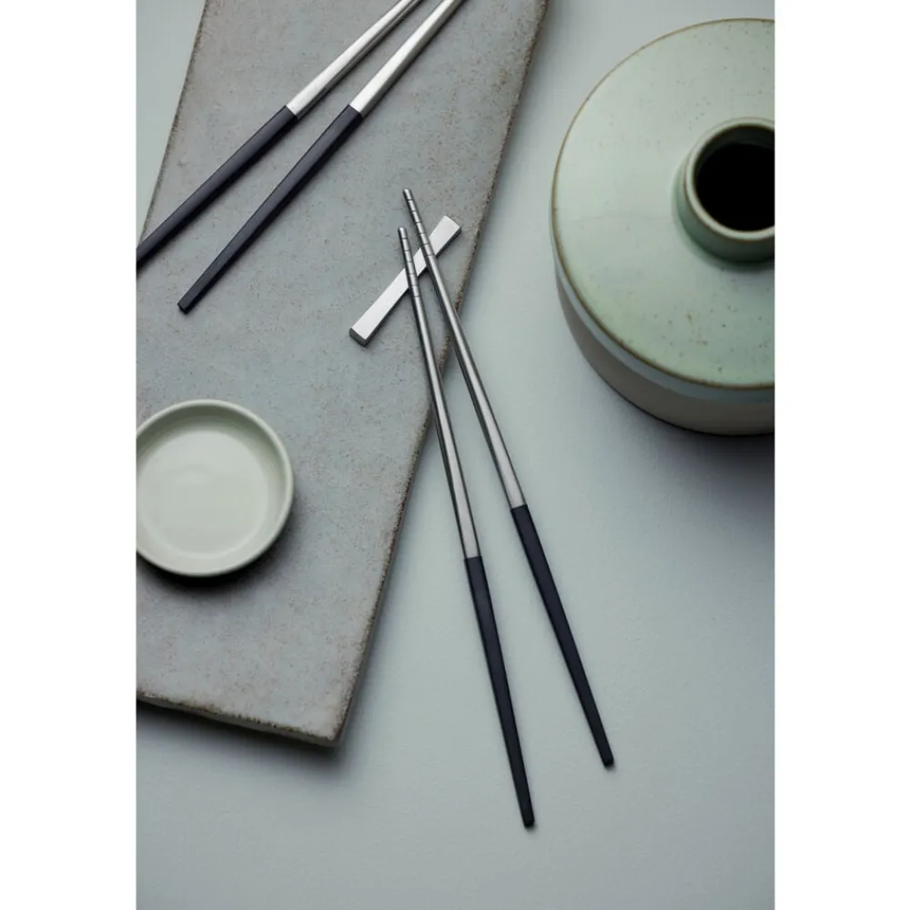 Focus de Luxes spisepinde har de samme stramme og tidløse linjer som Focus de Luxe bestikket. Designet er inspireret af koreanske spisepinde og er udviklet i samråd med koreansk ekspertise. Spisepindene er fremstillet i matpoleret rustfrit stål med en riflet overflade for at gøre det nemmere at fange maden og skafter i sort plast. Formen går fra at være elegant firkantet øverst til at blive rund nederst. Tåler opvaskemaskine, max. 55 °C.