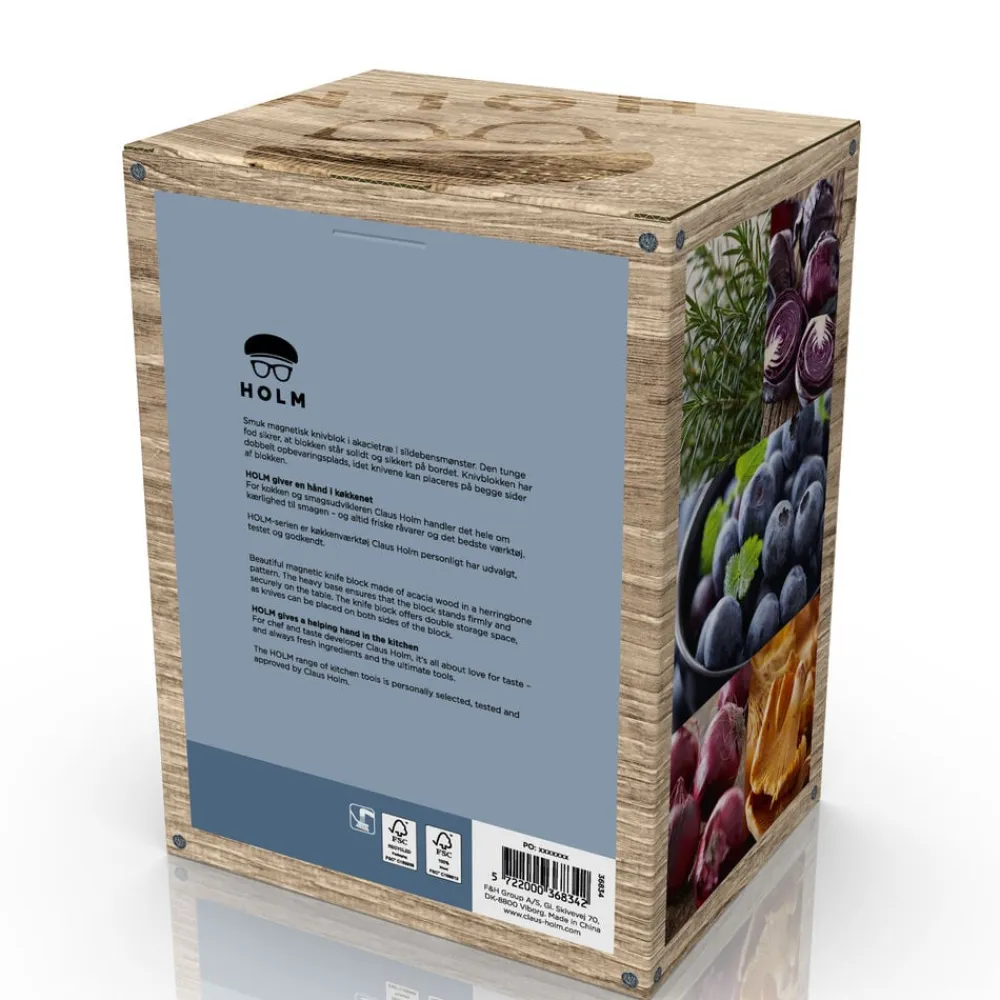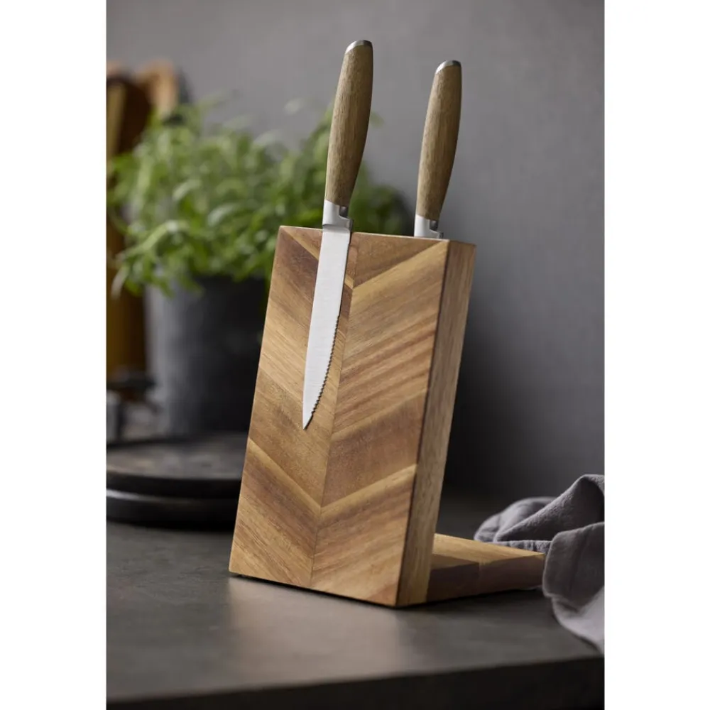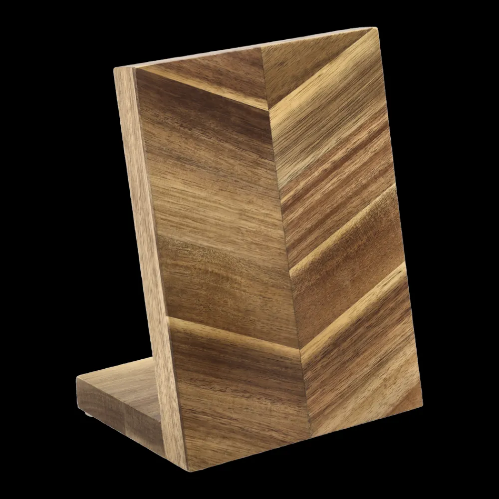Smuk magnetisk knivblok i akacietræ i sildebensmønster. Den tunge fod sikrer, at blokken står solidt og sikkert på bordet. Knivblokken har dobbelt opbevaringsplads, idet knivene kan placeres på begge sider af blokken.