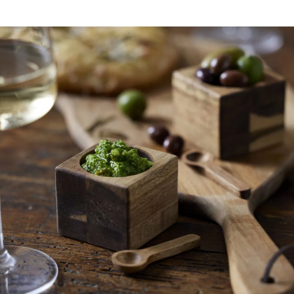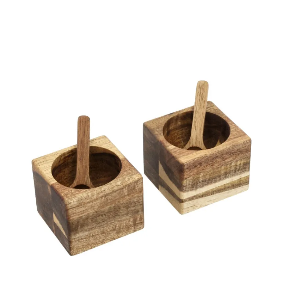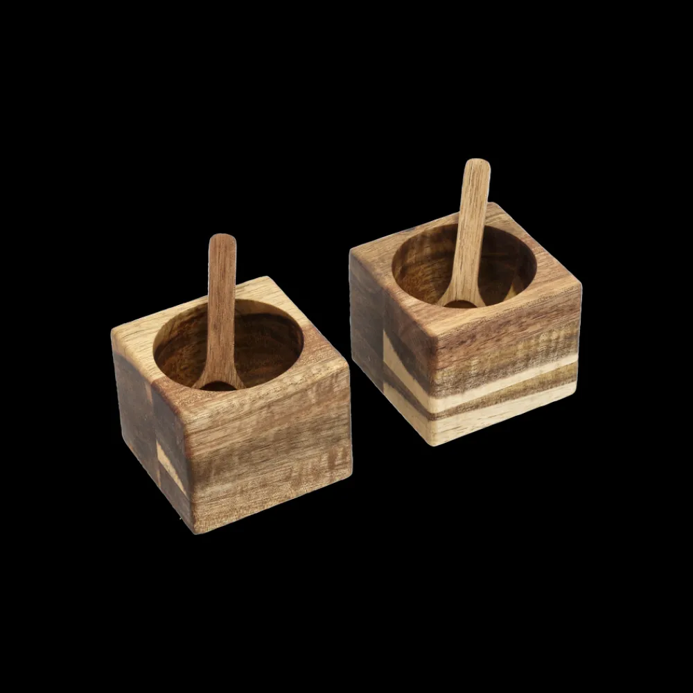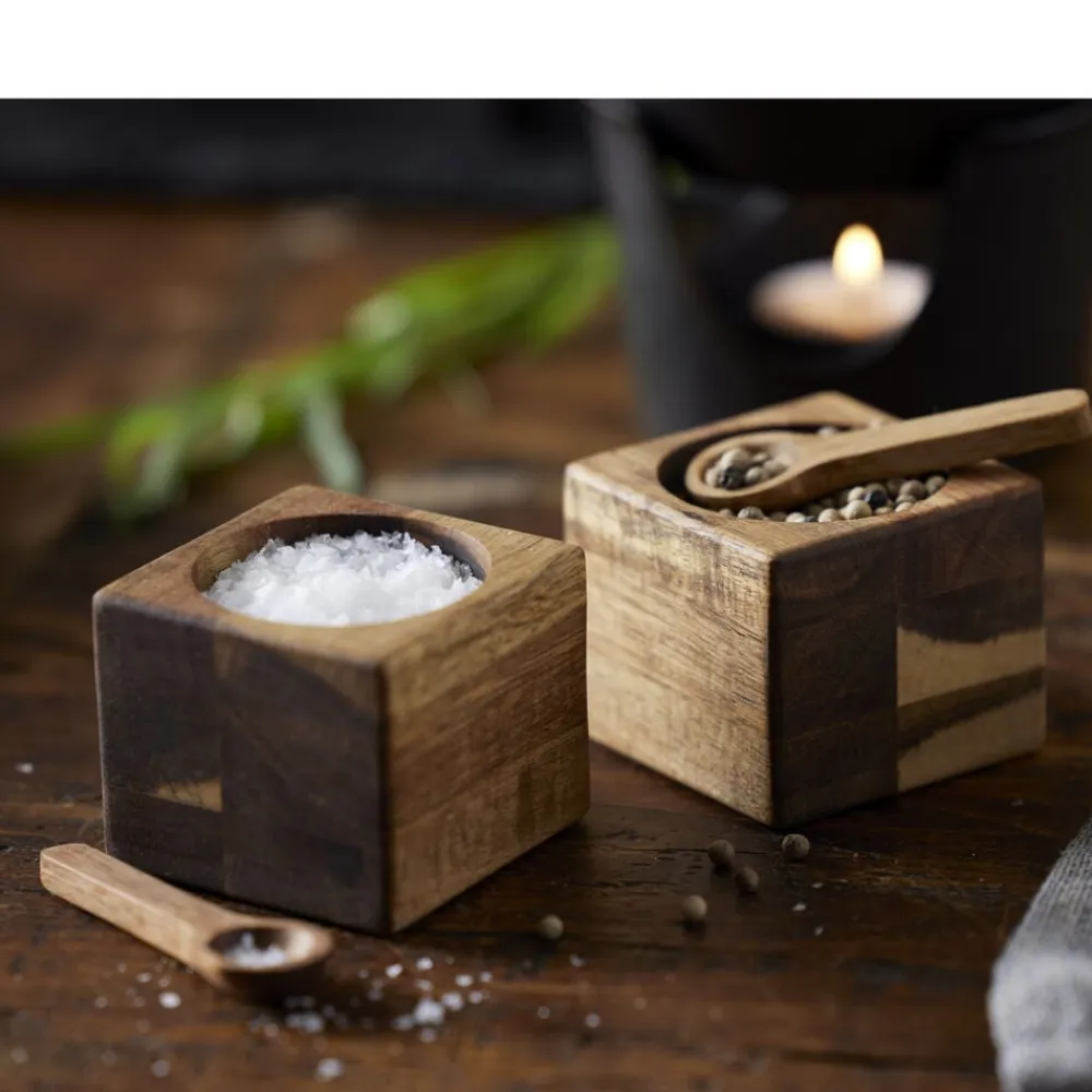 Det lækre miniskålesæt med to firkantede skåle i smukt akacietræ er ideelt til salt, krydderier, dip, nødder og lignende. Der medfølger to fine skeer i akacietræ. Skålene måler 6 x 6 x 5 cm, og skeerne er 7 cm lange.