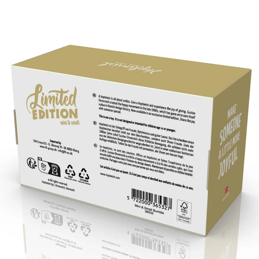 Mini Bumble er den mindste Hoptimist nogensinde, kun 5,8 cm høj, og den passer perfekt sammen med Bumble S, der måler 7,6 cm. Som markering af en ny begyndelse kan du nu få de to i en eksklusiv sampak, hvor begge har samme farve, og det kun er størrelsen, der adskiller dem. Det er trygt og godt for alle, uanset højde. Del glæden med en som står dig nær – en til dig, en til mig. Behold den ene selv og giv den anden til en, der betyder noget særligt – som storesøster og lillesøster, bedsteforælder og barnebarn, eller to gode venner, der altid hører sammen. Måske beholder du den ene og giver den anden videre – det vigtigste er, at de begge spreder glæde, uanset hvor de havner.