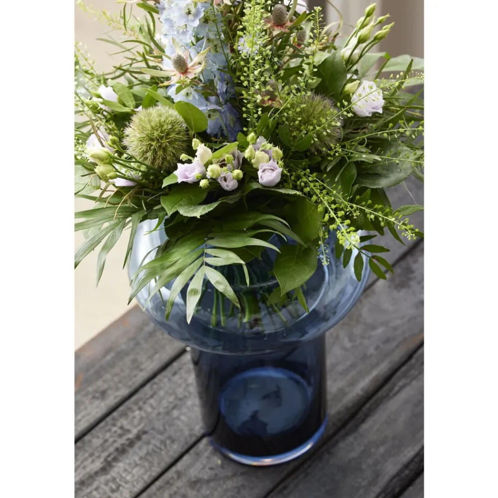 Tube-vasen er mundblæst, fremstillet af gennemfarvet glas og har en flot, slebet kant. Vasens unikke formsprog gør den til en skulptur i sig selv, og med sit enkle og moderne udtryk passer den perfekt til både friske og tørrede blomster.