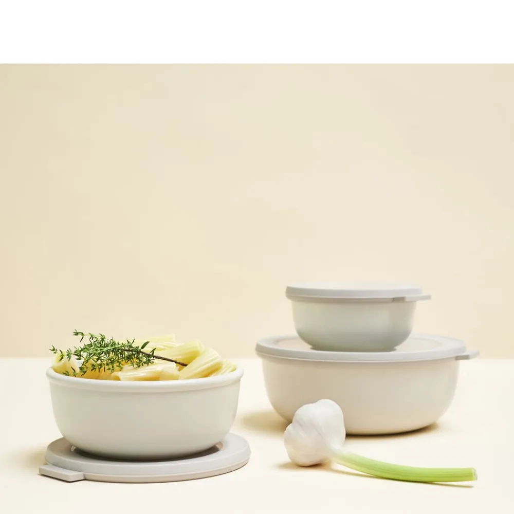 Mepal Cirqula opbevarings- og serveringsskål – rummelig og praktisk i kølige, nordiske farvetoner. Samtidig er skålen dekorativ og velegnet til servering. Sæt bestående af 500 ml, 1000 ml og 2000 ml.