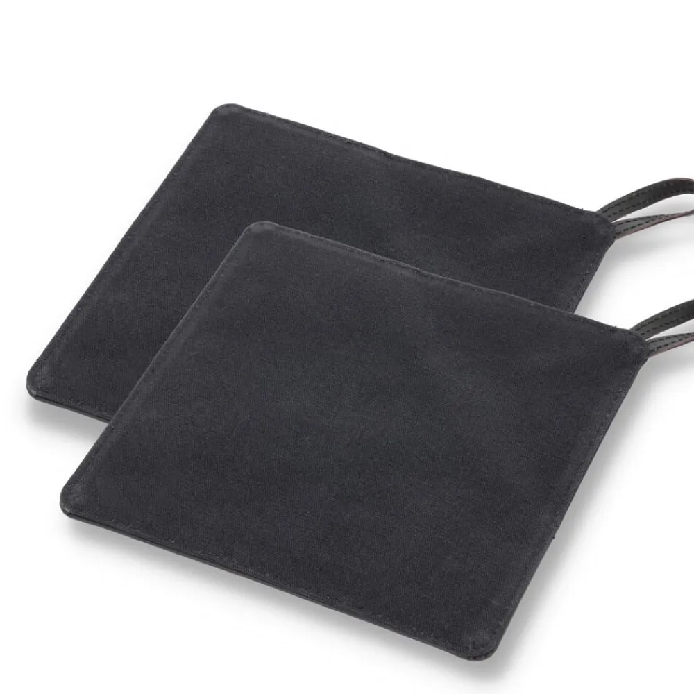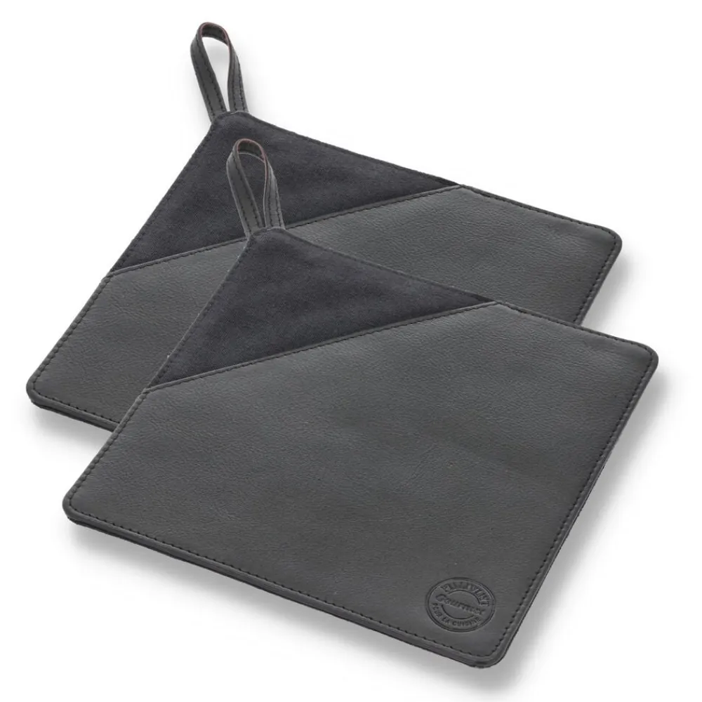 2 sorte grydelapper af kanvas og læder. Kanvas er 100 % bomuldsstof i en kraftig vævning. Det er slidstærkt og vandafvisende, hvilket gør det egnet til hverdagsbrug. Læderet er 100 % bøffellæder. Bøffellæder er slidstærkt og har stor elasticitet. Med passende pleje vil bøffellæder holde i lang tid og få patina, som fremhæver læderets skønhed. Grydelapperne har en lomme, der gør det nemt at gribe fat i fade m.m. De beskytter hele hånden, fx når du tager et varmt fad ud af ovnen.