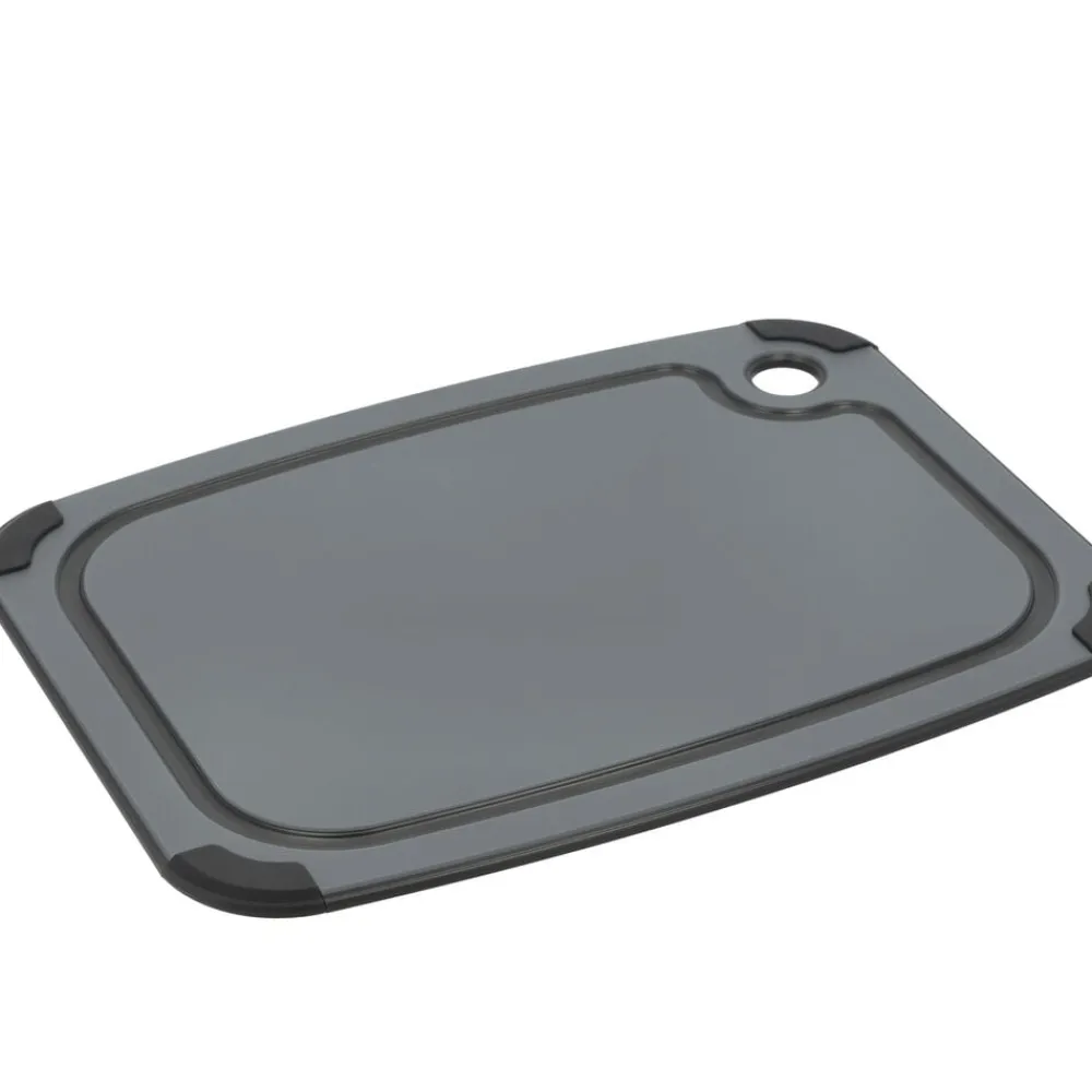 Skærebræt med praktiske silikonekanter, som sørger for, at brættet ligger stabilt på bordet, mens du hakker og skærer. Det kan anvendes på begge sider – den ene side har en bred saftrille til saftige madvarer og en glat side til alt det andet. Velegnet til opvaskemaskine.