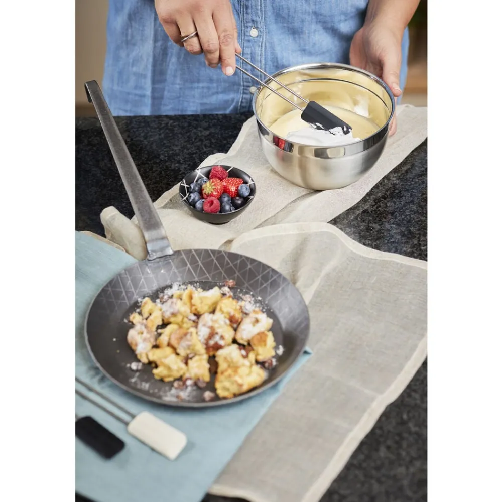 RÖSLE dejskraber med slidstærk silikone klarer temperaturer fra -30 °C til +230 °C samt fedtstoffer, olie m.m. Den fleksible side af silikonebladet tilpasser sig skålens form, mens den mere hårde side er perfekt til at udglatte. Tåler opvaskemaskine.