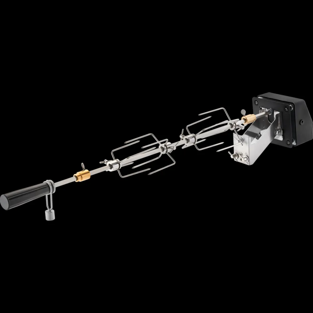 Sekskantet spyd i massivt rustfrit stål kan holde til en vægt på op til 10 kg. 4 robuste holdere til at fæstne kødet. Inkl. elmotor med strøm eller batteridrift. Batterier medfølger ikke. Strømforsyning 230V / 50 Hz til elmotor inkluderet. Velegnet til følgende modeller: MAGNUM G3, VIDERO G2 / G3 modeller, kulkedelgrill nr. 1 F60 med gourmetring.