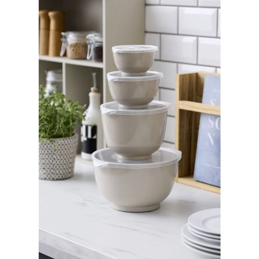 Margrethe røreskålesæt fra Rosti i 4 af de mest anvendte størrelser. Sættet indeholder 0,25 + 0,5 + 1,5 + 3 liter Margrethe-skåle med tilhørende låg.