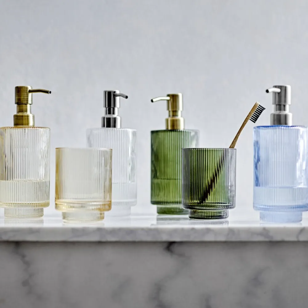 Clarity sæbedispenseren og tandbørsteholderen er lavet af riflet glas med et diskret bølgemønster. Den slanke silhuet giver et cool og elegant look.