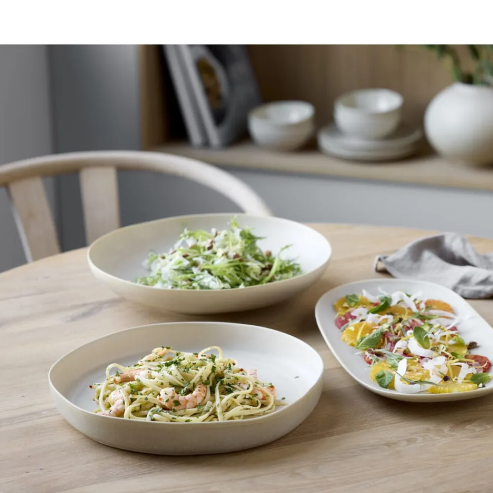 Shoku-salatskålen er skabt til større anretninger og friske salater. Med sin naturlige æstetik og silkebløde overflade tilføjer den et sofistikeret touch til borddækningen og fremhæver de friske farver og teksturer i dine råvarer. Velegnet til ovn op til 220 grader, mikroovn og opvaskemaskine.