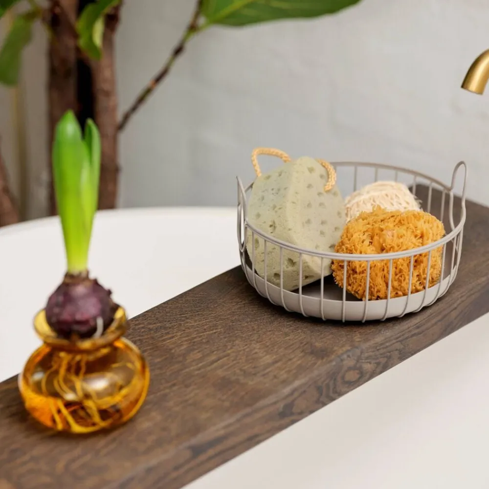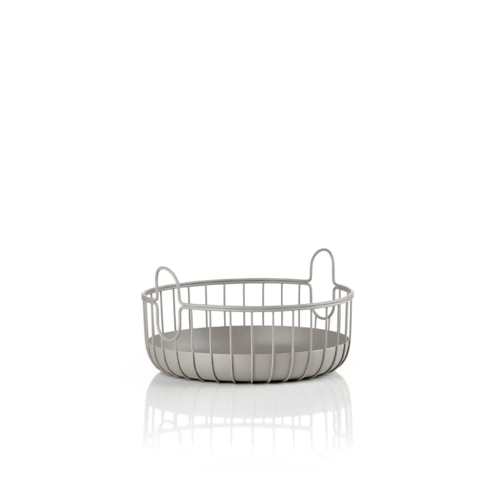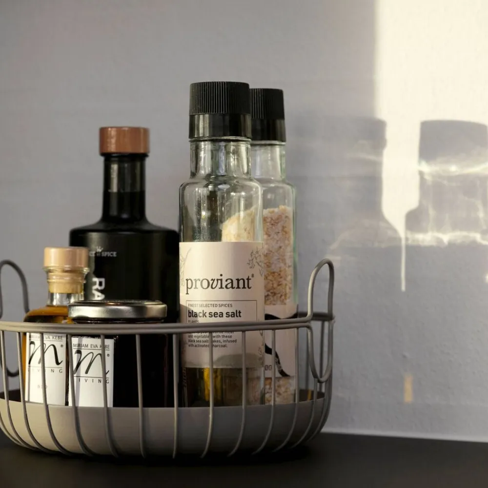 En måde at skabe forskønnende ro for øjet er at samle ting i grupper. Det gælder fx eddike- og olieflasker på køkkenbordet, men også ansigtsolier og parfumeflakoner på badeværelset. Til det formål er Inu-kurven genial. Med sine 22 centimeters bredde og blot 8 centimeters højde passer den ind mange steder uden at optage for meget bordplads. Det transparente trådlook i øverste del giver et let udtryk, mens den gennemgående bundplade sikrer stabilitet.