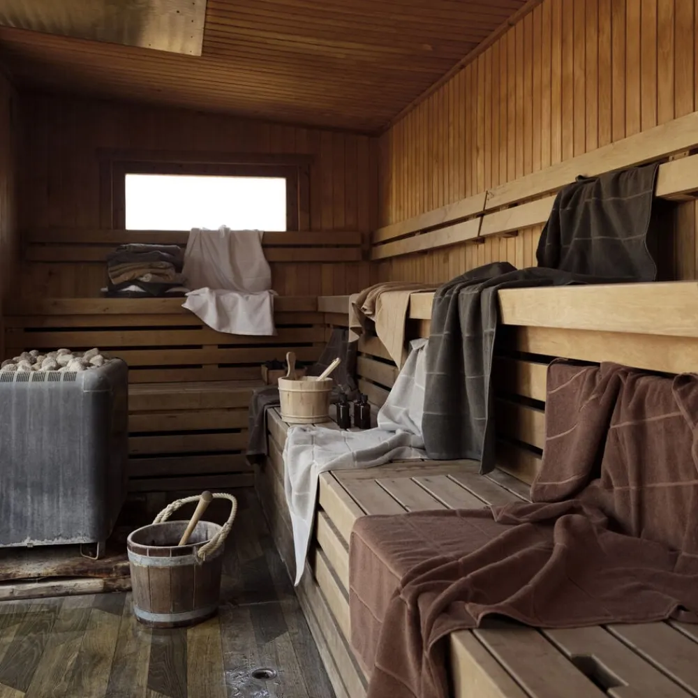 Sauna er navnet – og striberne taler for sig selv. Serien er inspireret af de stramme linjer i en klassisk træbeklædt sauna, hvor designet leger elegant med perspektiv og farvebalance. Hver side af håndklædet fremhæver sin egen dominerende farve – en fin detalje, der giver dig to forskellige udtryk i ét og samme håndklæde