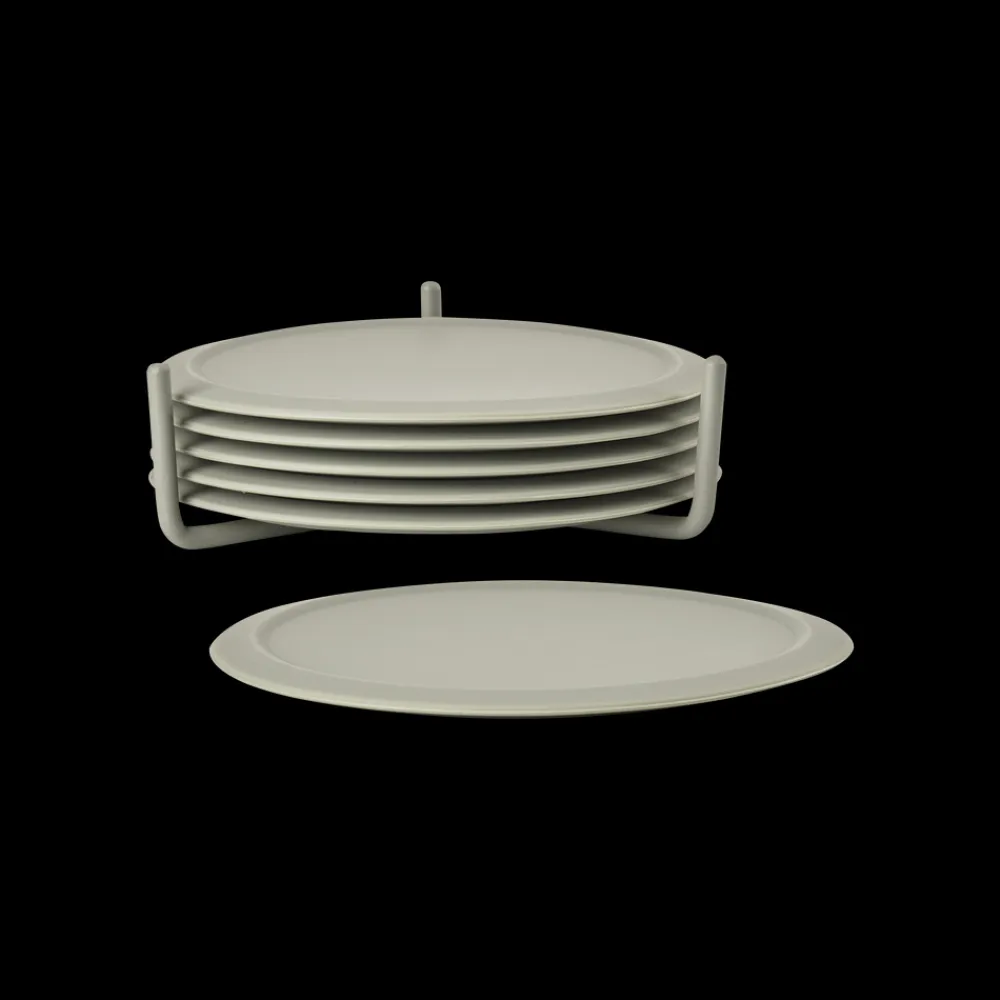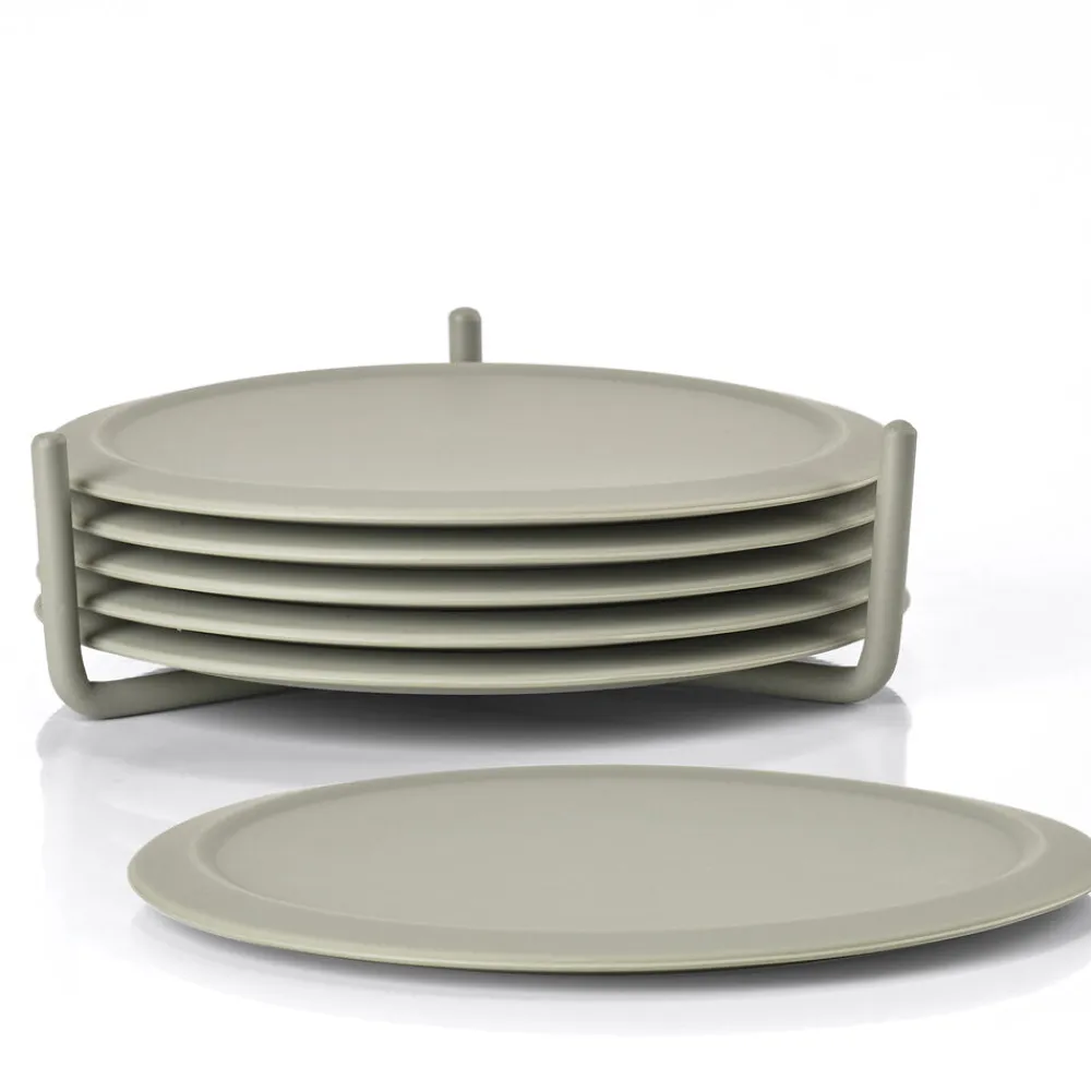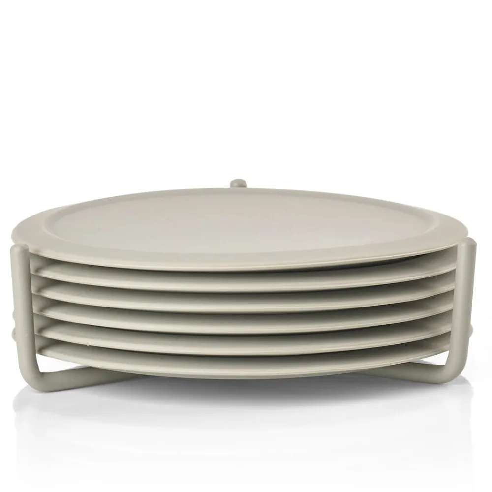 Flotte farvede glasbrikker i silikone. En blød og lydløs landing – sådan kan man bedst beskrive det, når man stiller et glas fra sig på glasbrikken i silikone. Leveres i sæt med seks glasbrikker i praktisk metalholder. Nemme at rengøre. D: 10 cm.