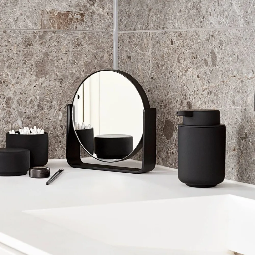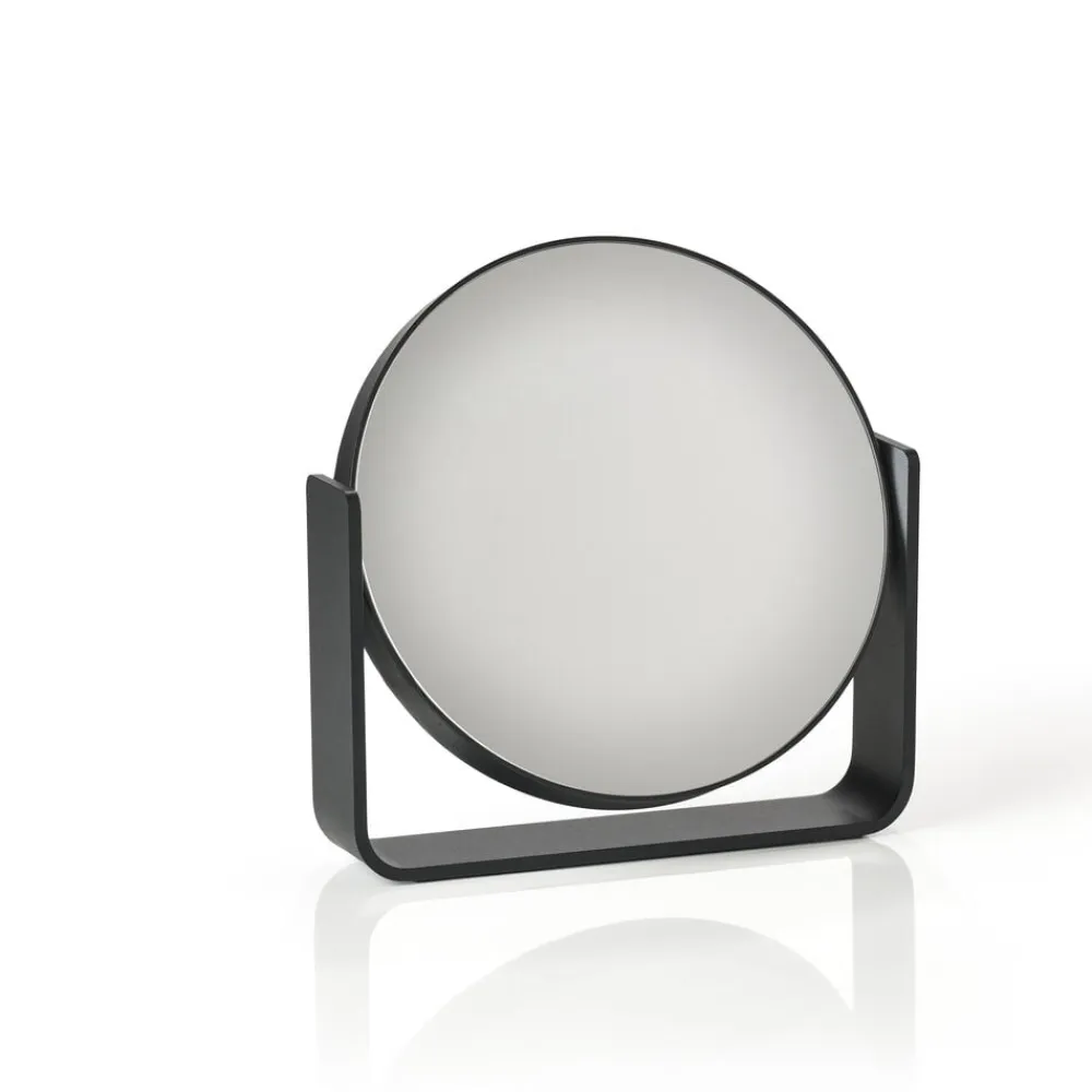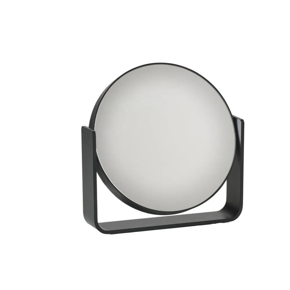 Uundværligt bordspejl, der pynter, hvor end du placerer det. Den ene side er almindeligt spejl, mens den anden forstørrer hele fem gange. Spejlet roterer sikkert om egen akse, da det bæres af en bred aluminiumsramme, som samtidig udgør spejlets stabile base. Det er pulverlakeret og har et fint mat look. Spejlet glider smukt ind i den populære UME-serie og fås i alle 7 farver: Black, White, Soft Grey, Grey, Eucalyptus, Taupe, Olive Green.