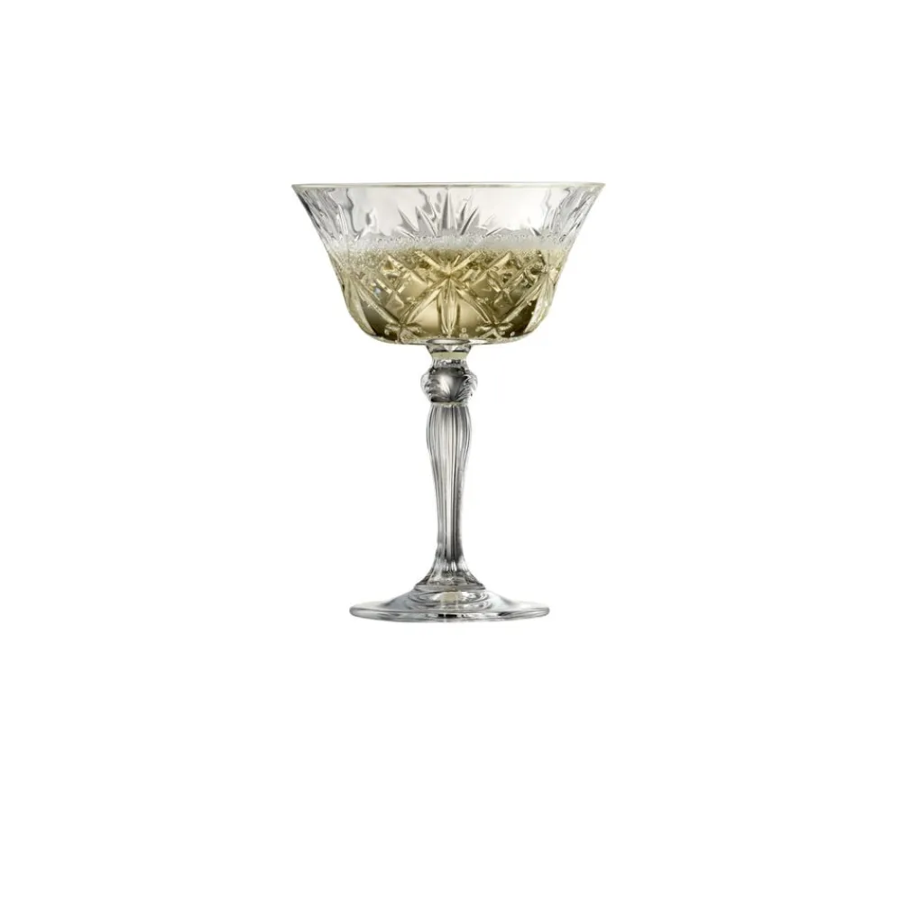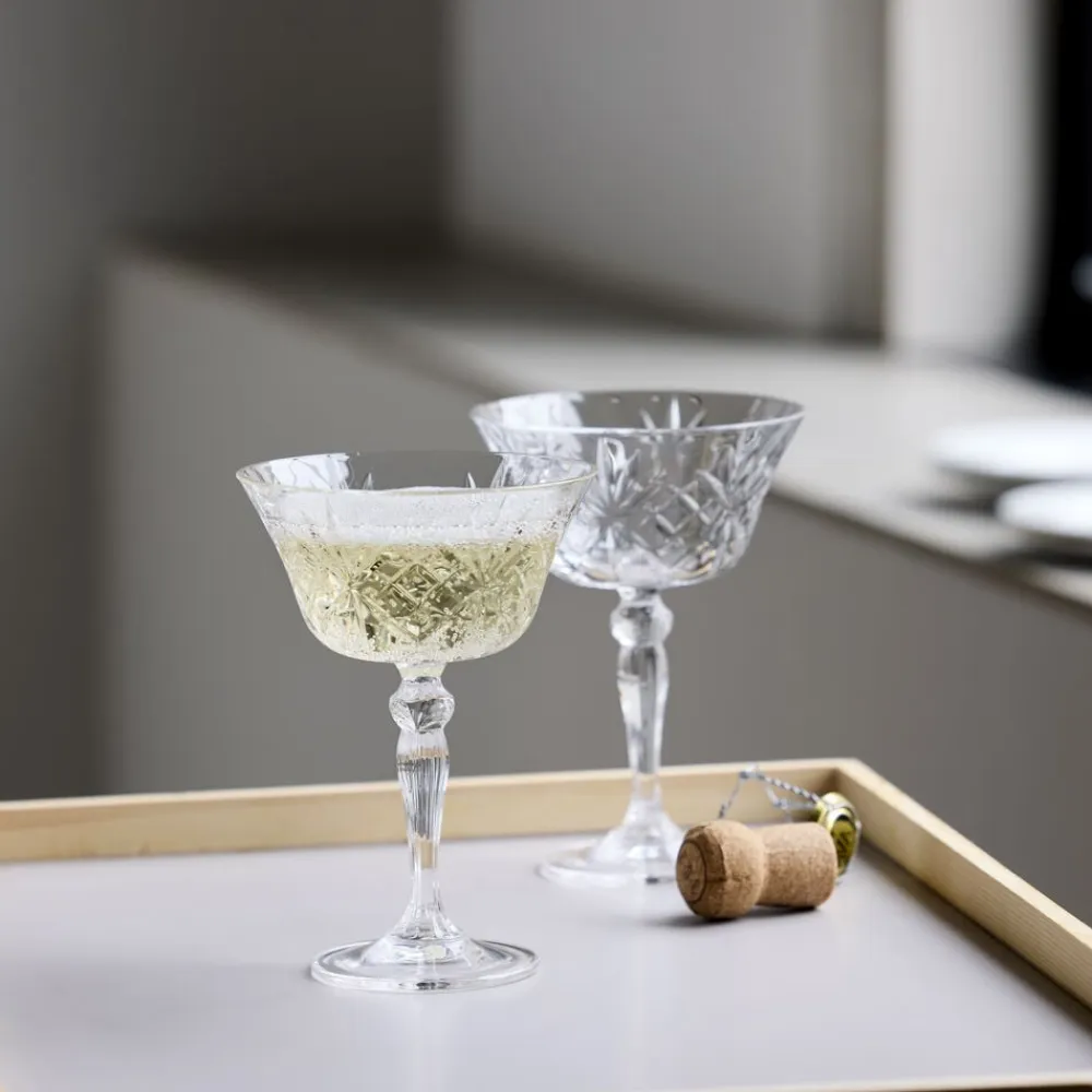 Champagneskålen fremhæver sit perlende indhold på smukkeste vis, når glassets elegante mønster reflekterer omgivelsernes lys og skygger. 26 cl, 4 stk.