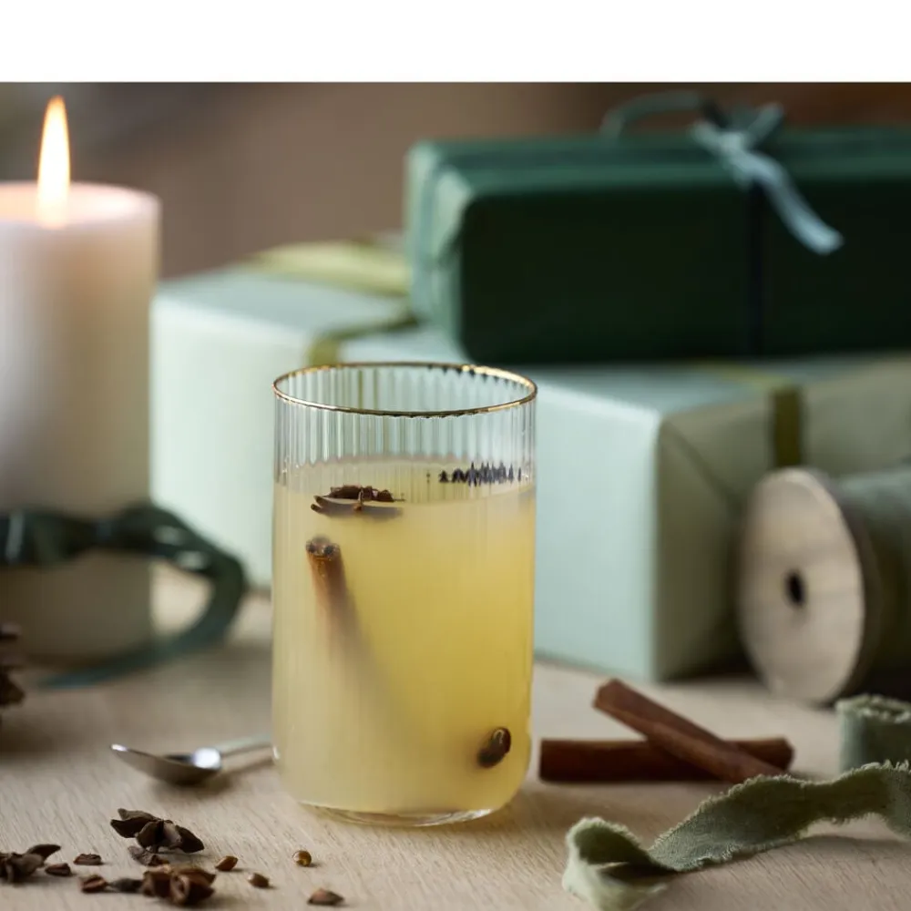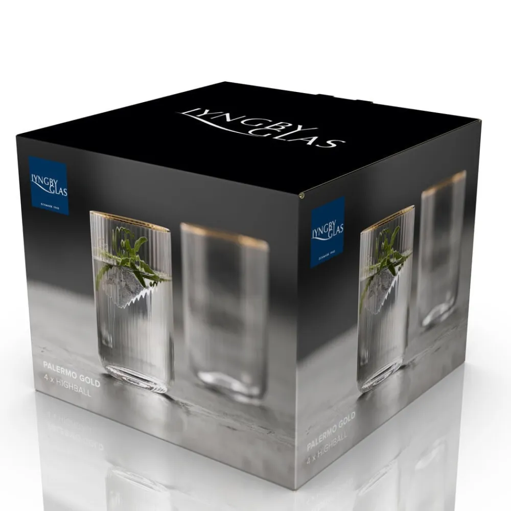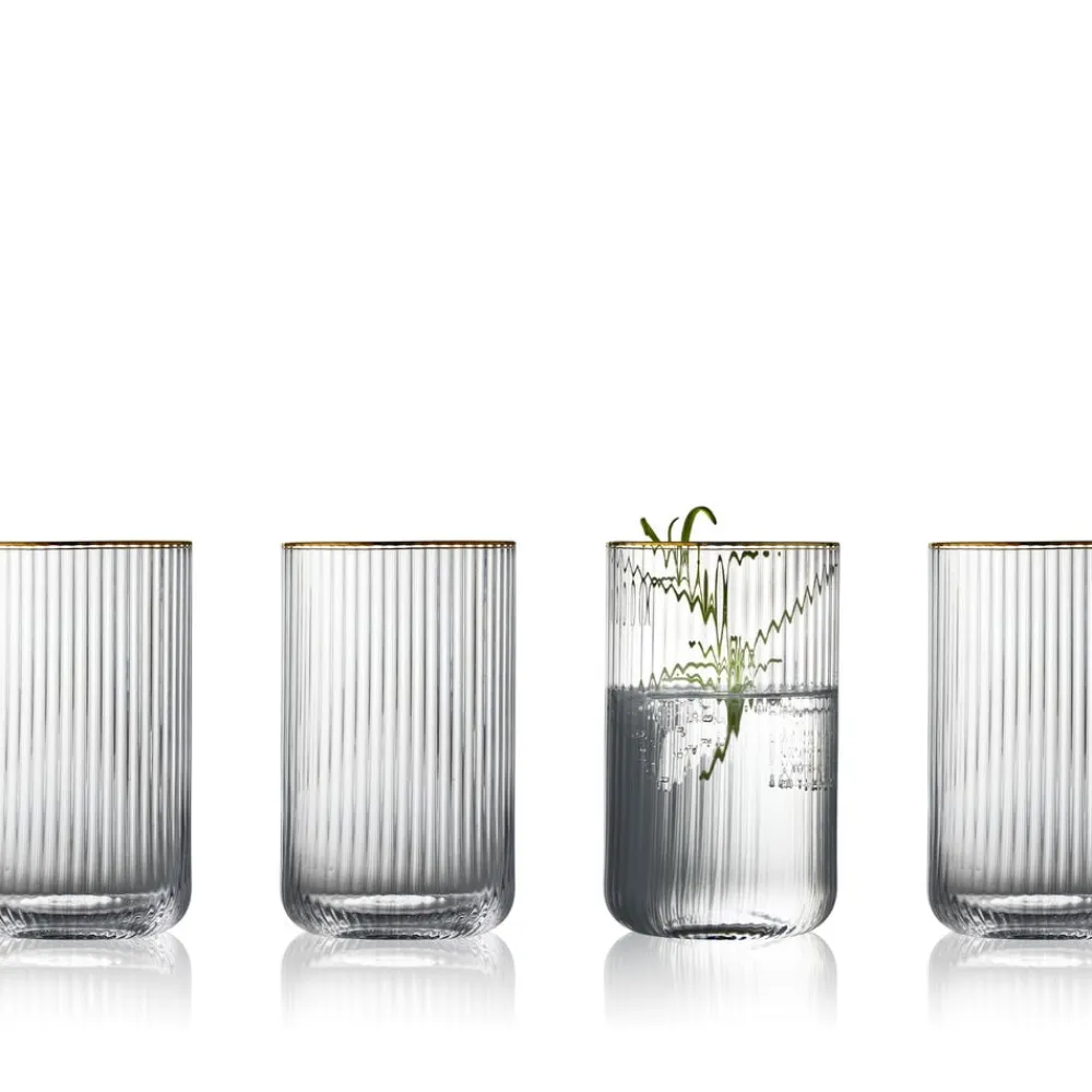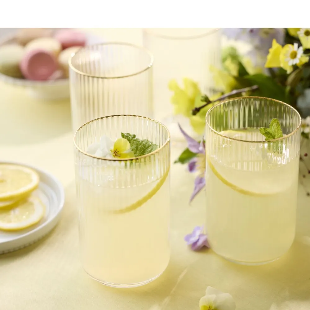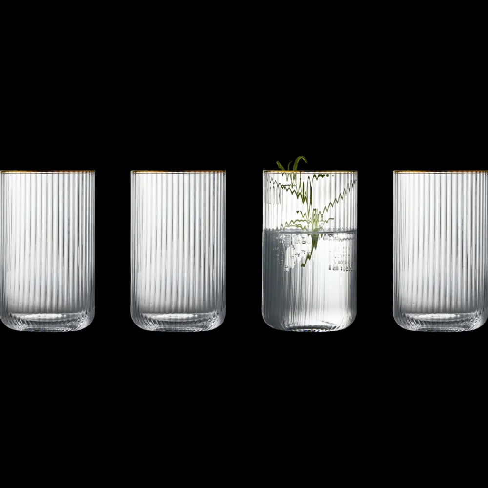 Smukt highballglas med bløde, rundede former. Det elegante, riflede design med en fin guldkant giver glasset et flot vintagelook, der samtidig afspejler tidens trends. Brug det til alt fra spritz og mojitos til hjemmelavet lemonade eller en iskold iste – og lad de fine facetter reflektere lyset og glassets indhold på smukkeste vis. 50 cl. Sæt med 4 stk.
