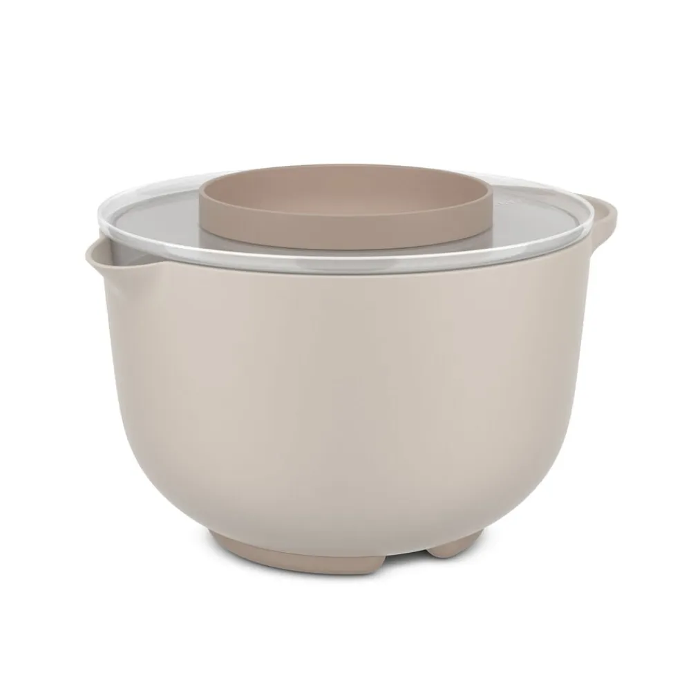 Røreskålen er lavet af pp, et plastmateriale, der tåler mikrobølgeovn og temperaturer op til 110 °C. To smarte åbninger i den skridsikre bundring under røreskålen forhindrer, at der samler sig vand, når du sætter skålen på hovedet i opvaskemaskinen.