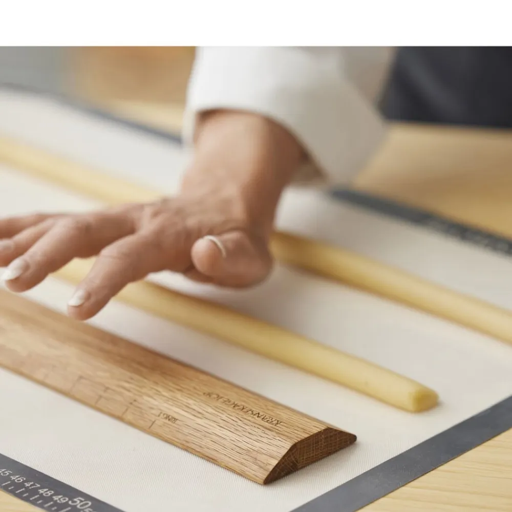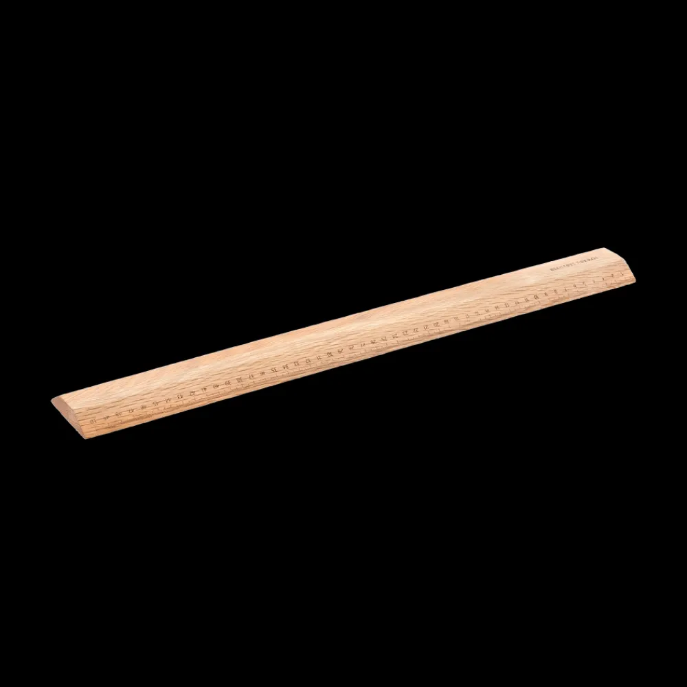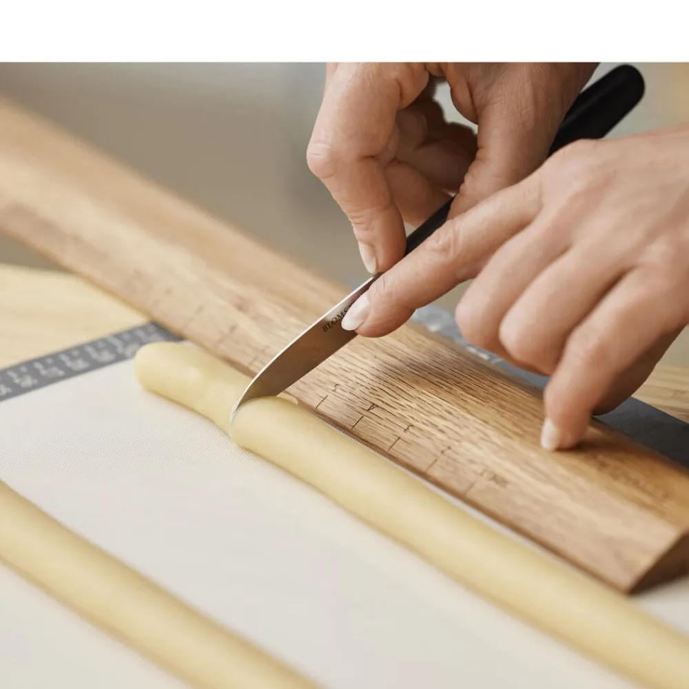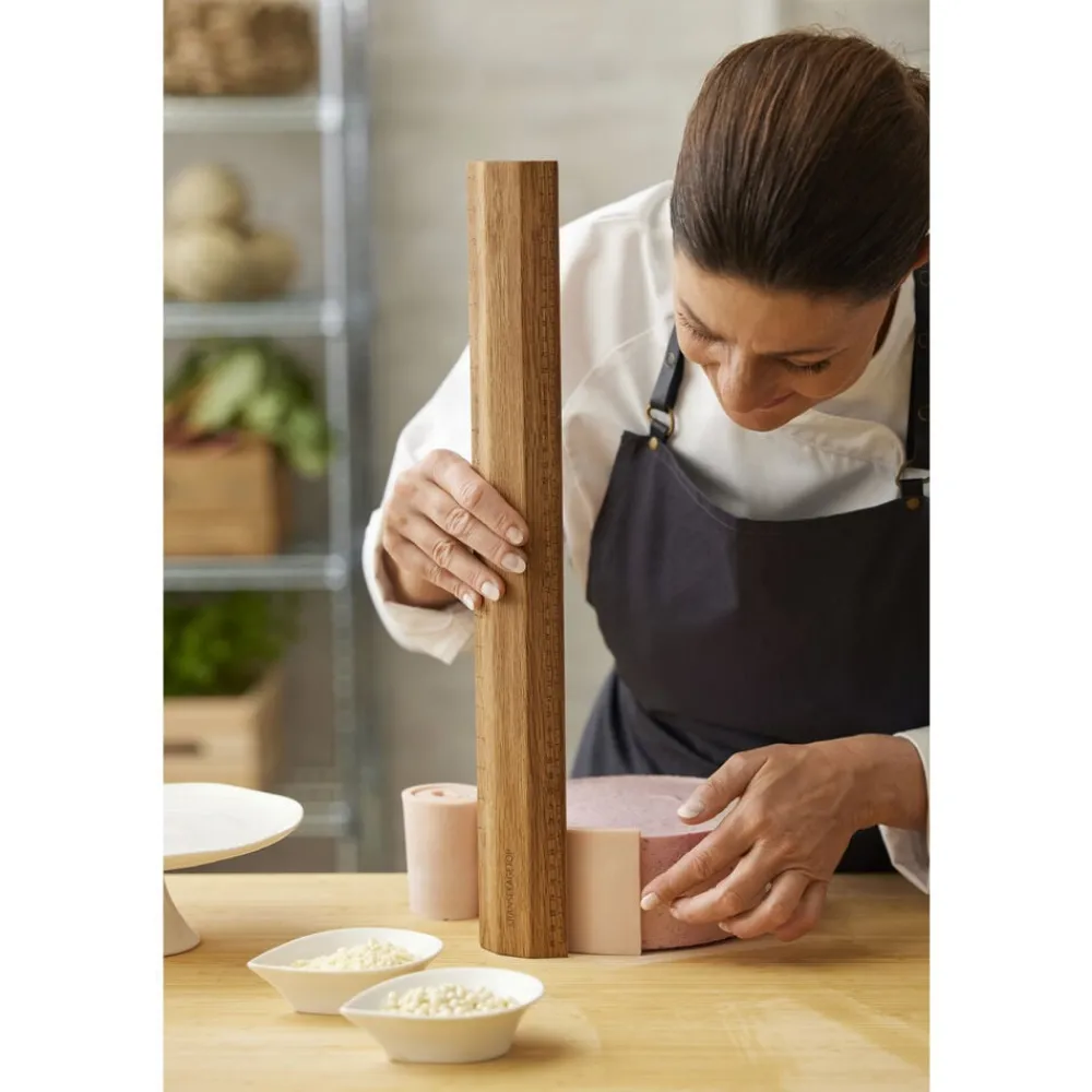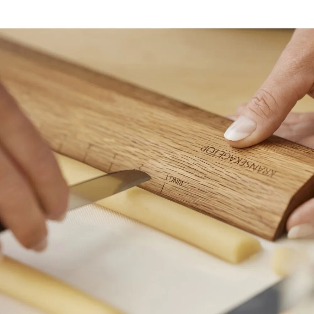 Den flotte lineal i smukt egetræ kan du bruge til at udmåle alt det, der skal afpasses til bestemte og lange mål, for eksempel tærtedejens diameter, omkredsen af marcipanbåndet, bredden af hindbærsnitterne og meget mere. Linealen er 51 cm lang med letlæselig centimeterskala langs den ene side og afmærkning til at lave ringene til en kransekagetop langs den anden.