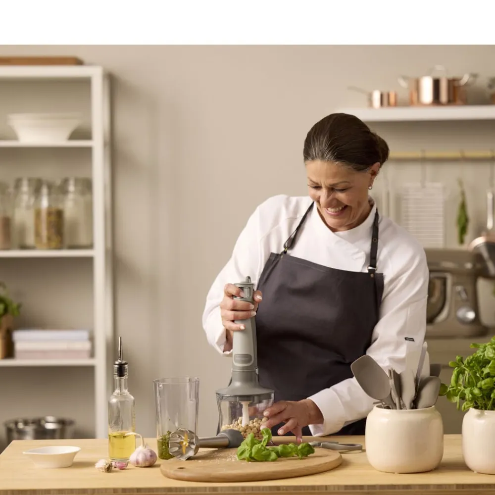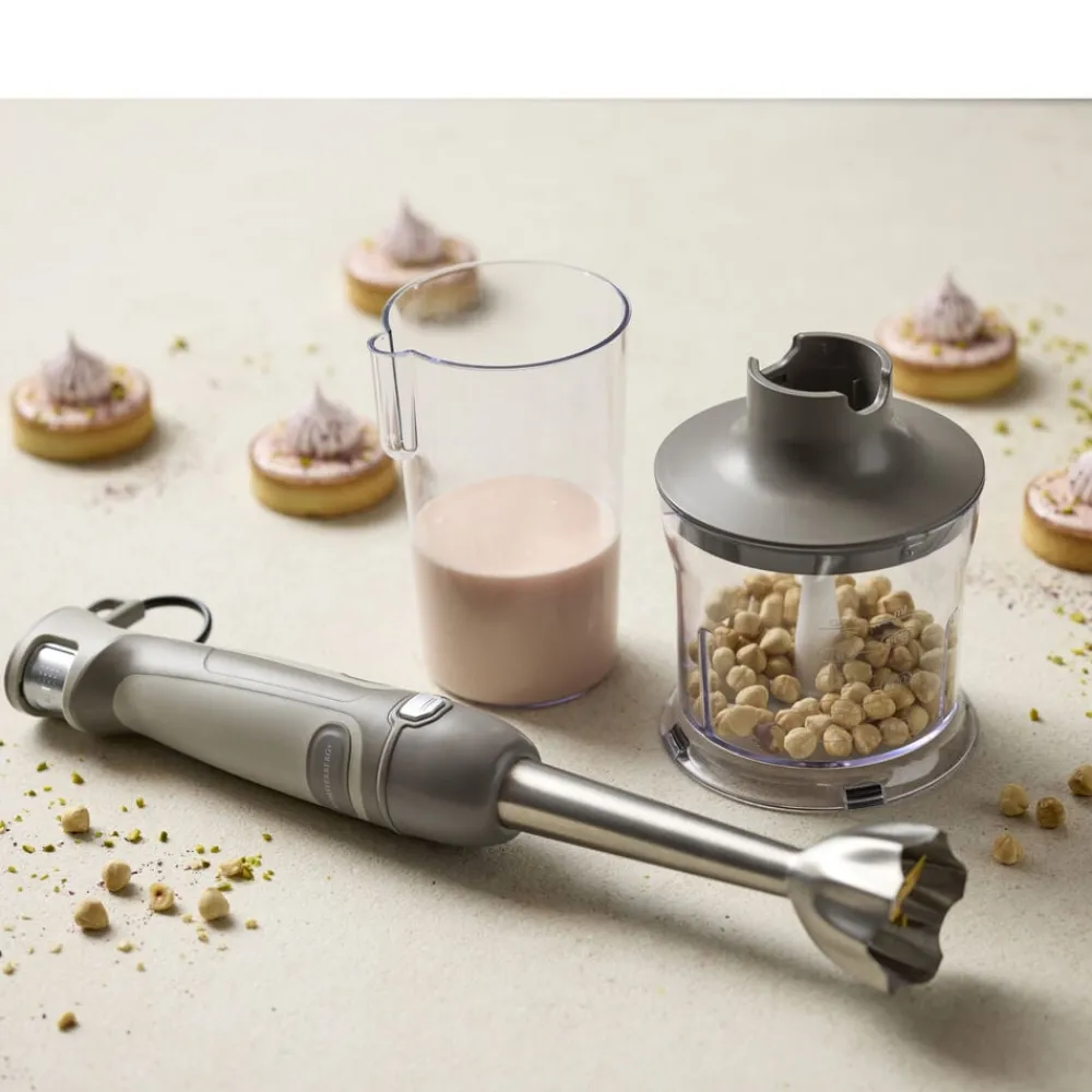 Stavblendersæt til både små og store køkkenopgaver. Stavblenderen har glidende hastighedsjustering og lader dig styre tempoet med én knap. Sættet indeholder en 500 ml minihakker, der hurtigt klarer nødder, krydderurter og grøntsager samt et 600 ml målebæger, som er perfekt til at måle ingredienser eller blande mindre portioner direkte i bægeret.