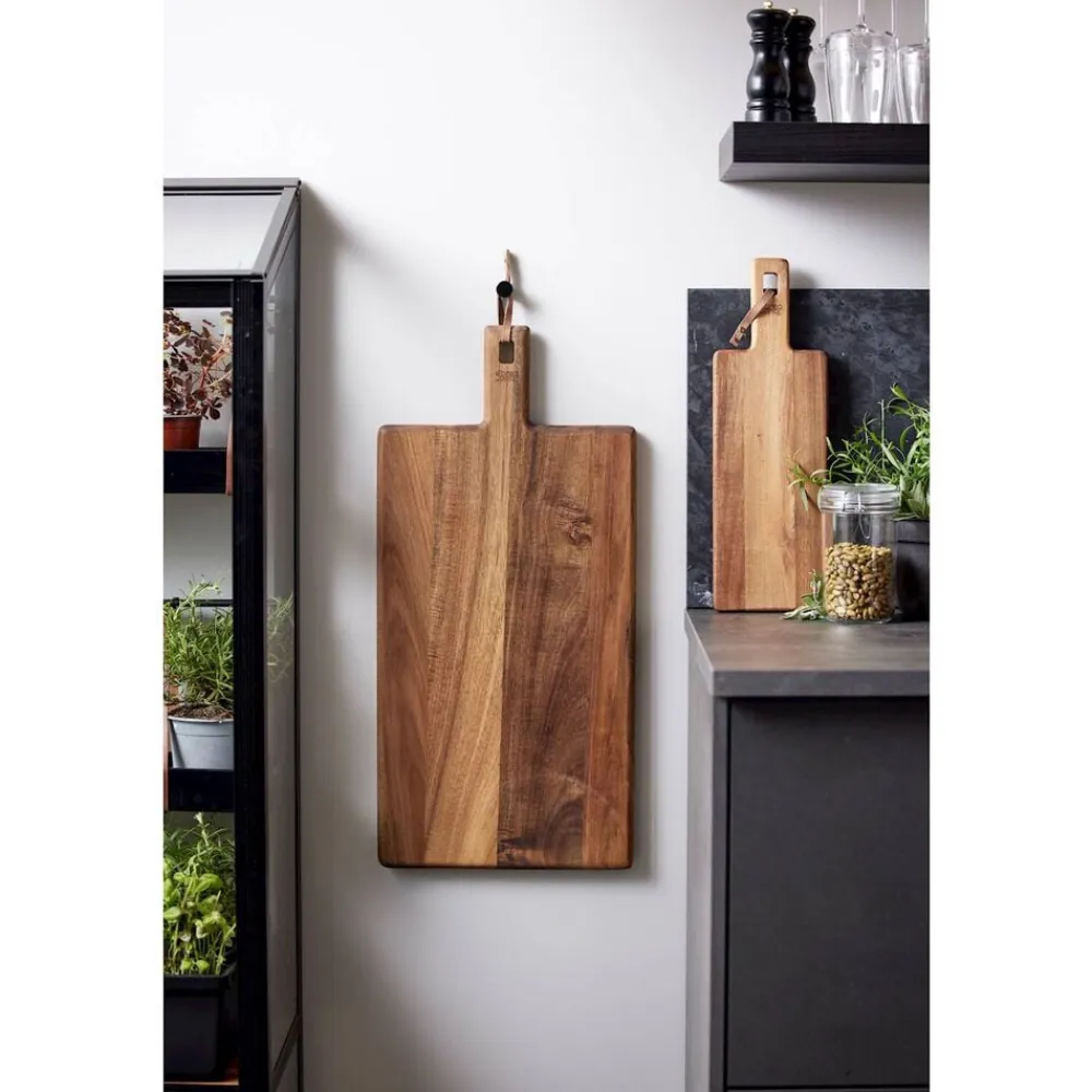 Skærebræt 72 x 20 x 2,5 cm i naturligt akacietræ. Skærebrættet er en smuk tilføjelse til køkkenet og er velegnet til fisk, kød og grøntsager. Vaskes med varmt vand og mild sæbe. Tåler ikke opvaskemaskine. Brættet kan med fordel efterbehandles med olie et par gange om året for at bevare den flotte overflade.